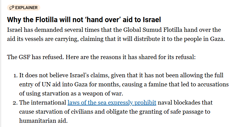 F EXPLAINER Why the Flotilla will not ‘hand over’ aid to Israel Israel has demanded several times that the Global Sumud Flotilla hand over the aid its vessels are carrying, claiming that it will distribute it to the people in Gaza. The GSF has refused. Here are the reasons it has shared for its refusal: 1. It does not believe Israel's claims, given that it has not been allowing the full entry of UN aid into Gaza for months, causing a famine that led to accusations of using starvation as a weapon of war. 2. The international laws of the sea expressly prohibit naval blockades that cause starvation of civilians and obligate the granting of safe passage to humanitarian aid.