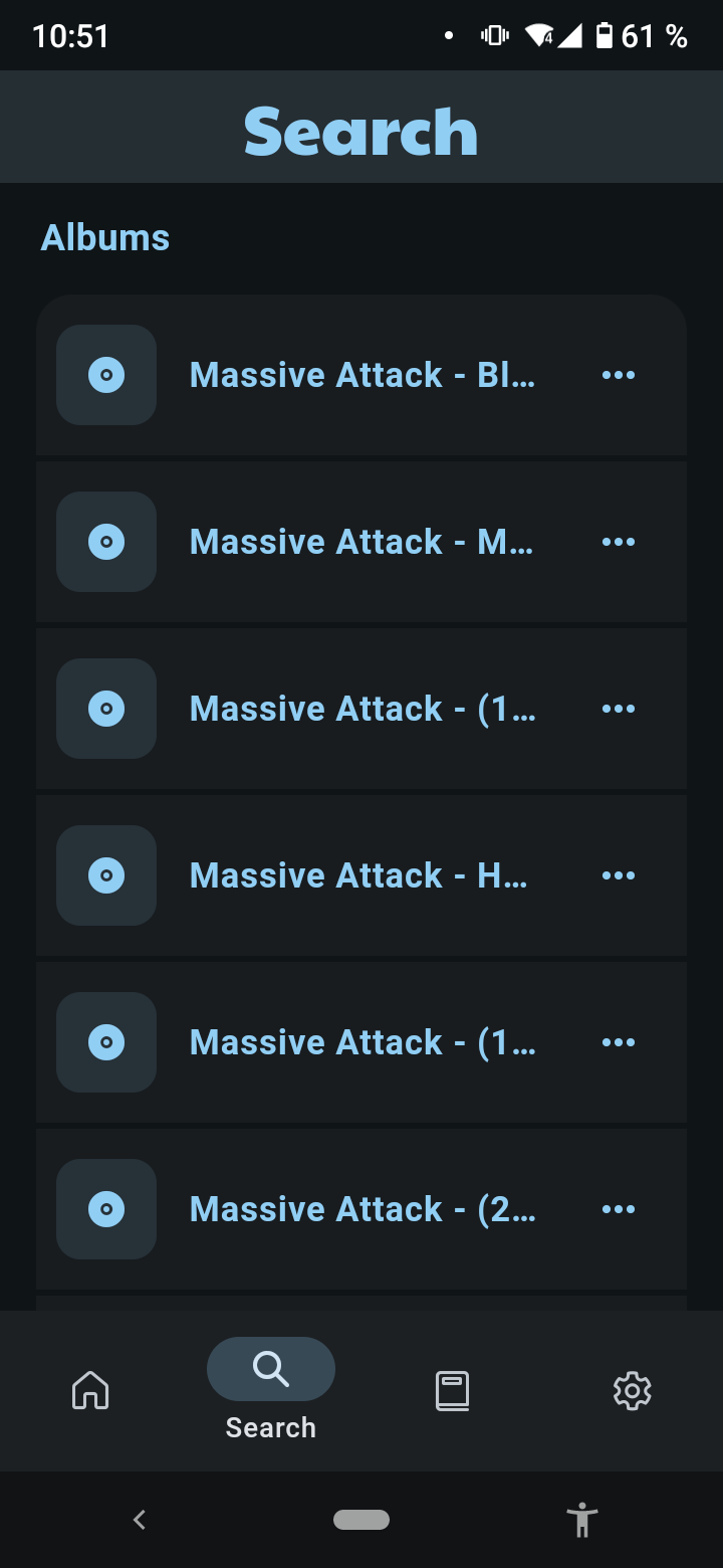 Chacun des résultats de la liste présente le nom de l'artiste, Massive Attack, avant le nom de l'album, qui est constamment tronqué après une ou deux lettres.