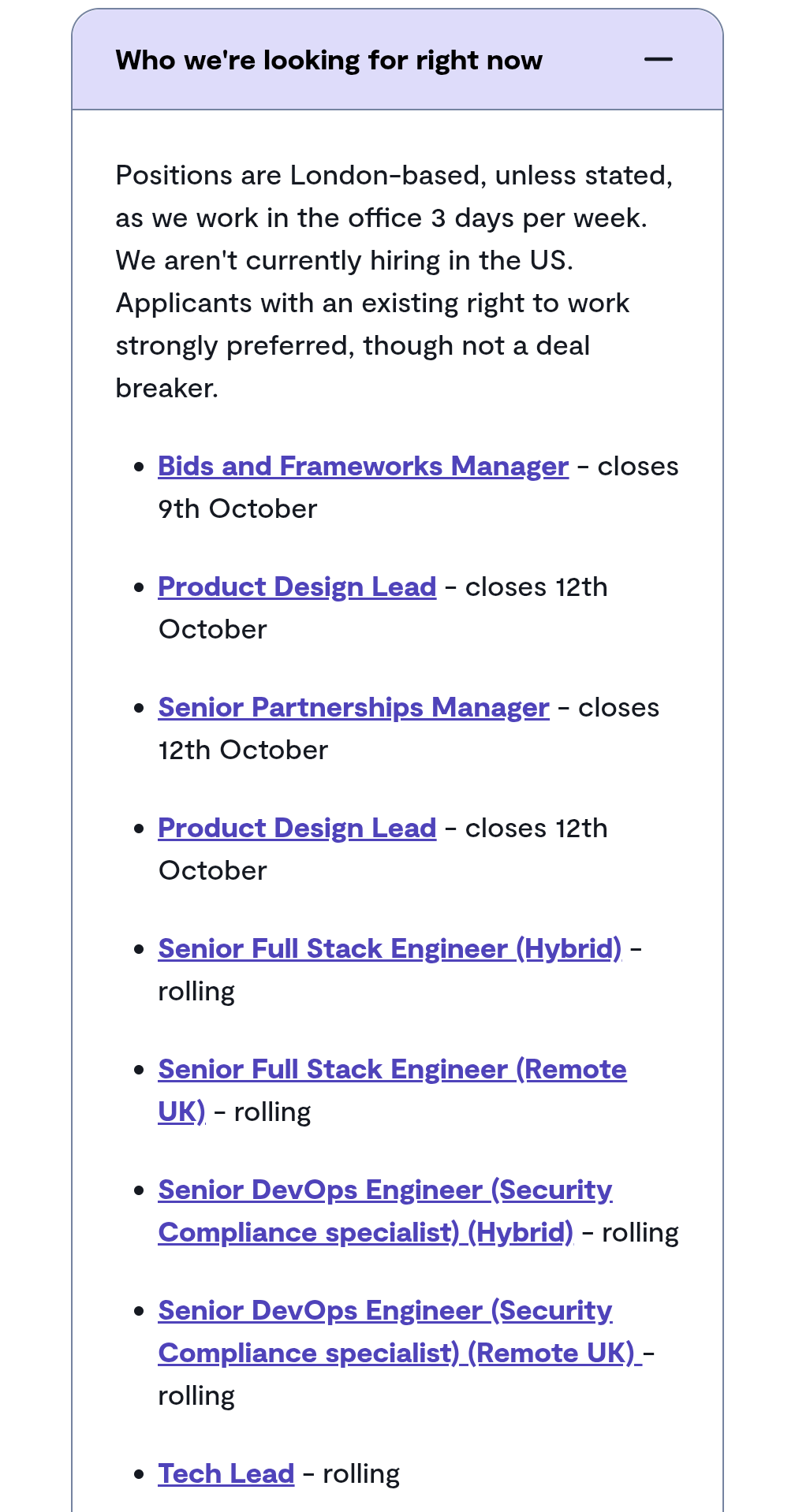 Positions are London-based, unless stated, as we work in the office 3 days per week. We aren't currently hiring in the US. Applicants with an existing right to work strongly preferred, though not a deal breaker. Bids and Frameworks Manager - closes 9th October Product Design Lead - closes 12th October Senior Partnerships Manager - closes 12th October Product Design Lead - closes 12th October Senior Full Stack Engineer (Hybrid) - rolling Senior Full Stack Engineer (Remote UK) - rolling Senior DevOps Engineer (Security Compliance specialist) (Hybrid) - rolling Senior DevOps Engineer (Security Compliance specialist) (Remote UK) - rolling Tech Lead - rolling