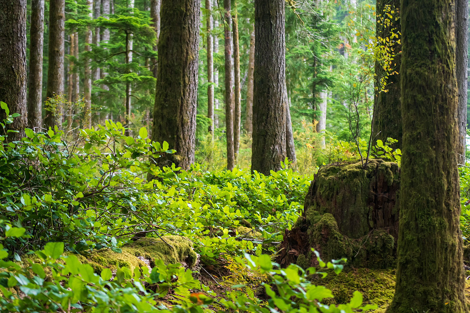 Bottom of the forest in a gentle rain. Salal, trunks, moss, huckleberry on a stump. New blog post: https://wanderinweeta.blogspot.com/2025/09/view-from-forest-understory.html #VancouverIsland #Forests #Plants #Landscapes #Nature