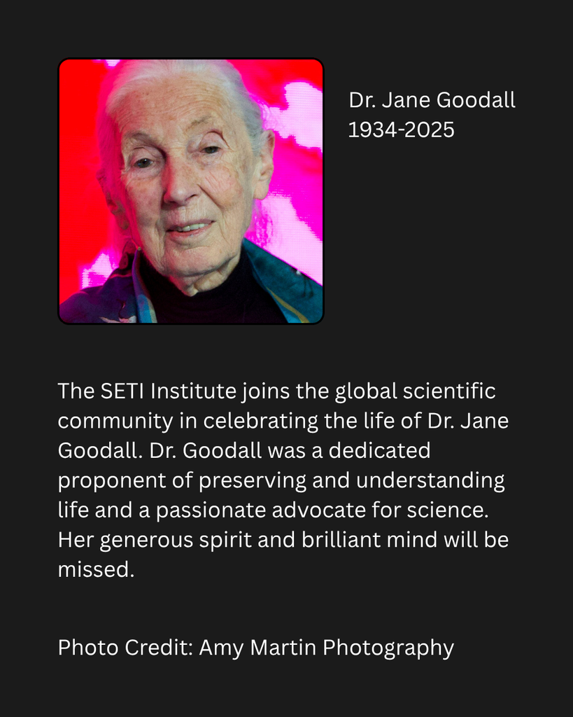 The SETI Institute joins the global scientific community in celebrating the life of Dr. Jane Goodall. Dr. Goodall was a dedicated proponent of preserving and understanding life and a passionate advocate for science. Her generous spirit and brilliant mind will be missed.