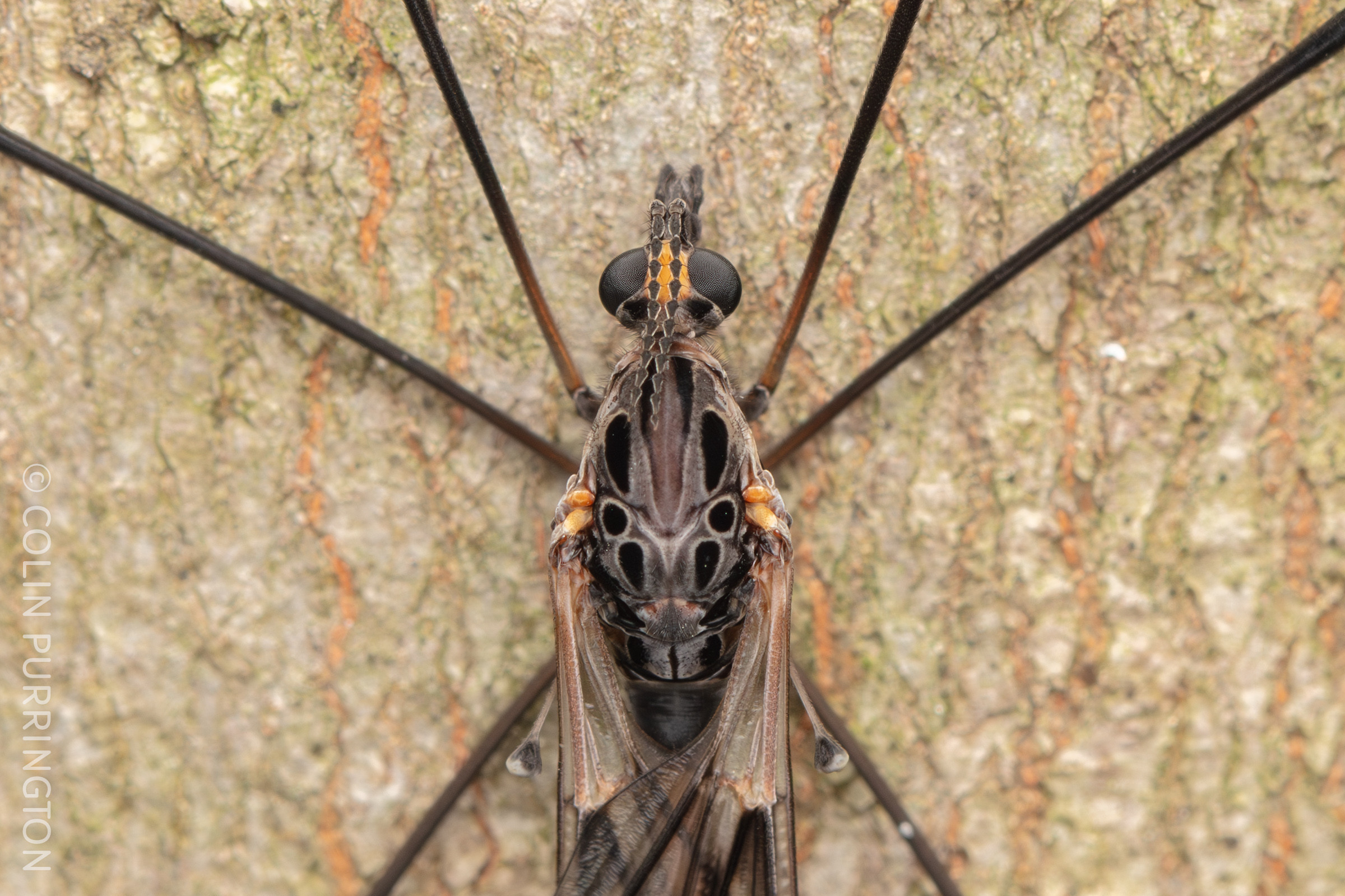 Giant crane fly (Tipula abdominalis). If you include the legs it was approximately 5 inches in length, so definitely a fly of unusual size (FOUS). I've cropped the image to show how pretty the thorax is. #diptera #cranefly #flies #entomology #tipula #tipulidae #insects #nature