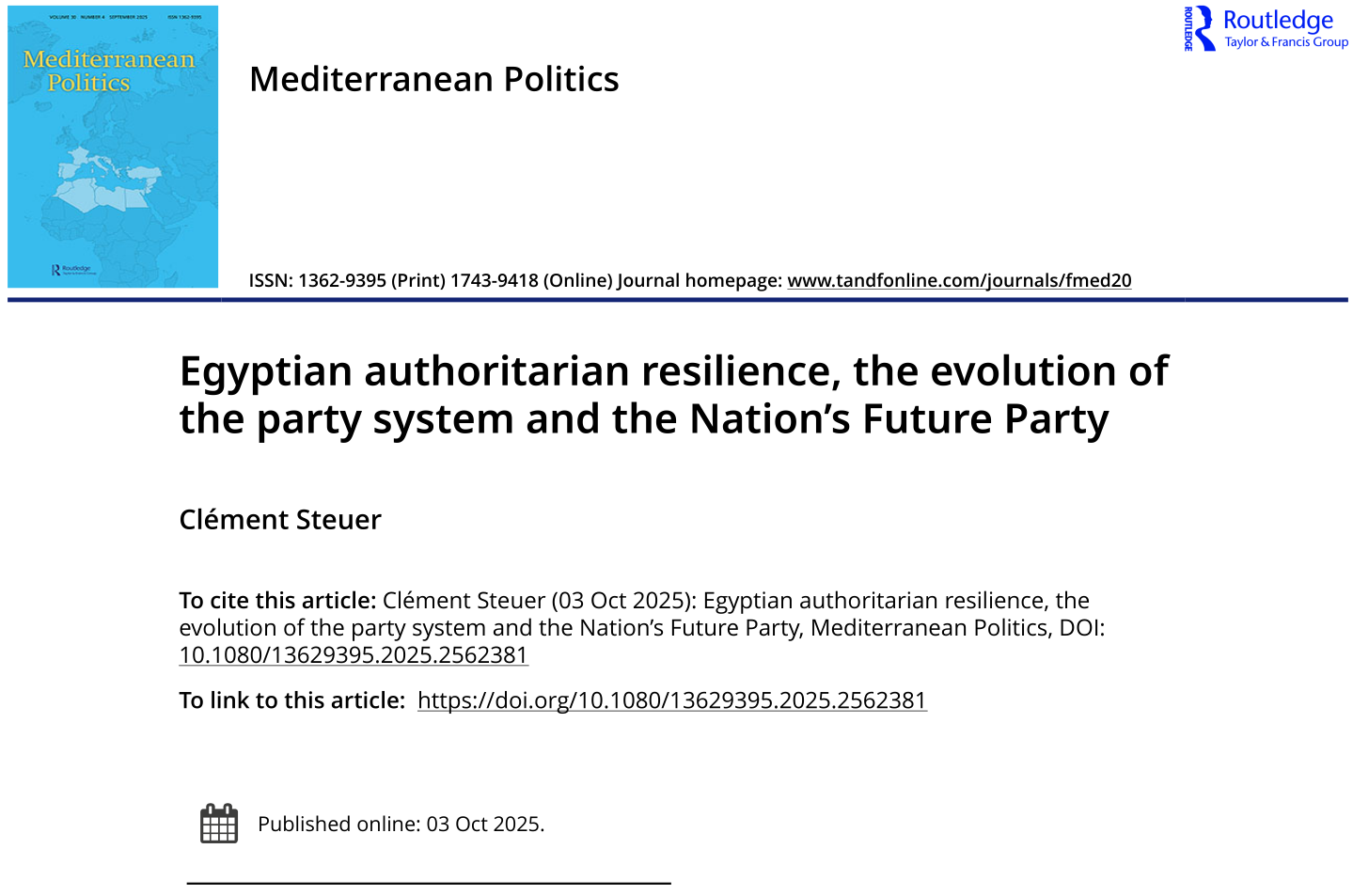 My latest article deals with the Egyptian current party system, with a focus on the now dominant party, the Nation's Future party.