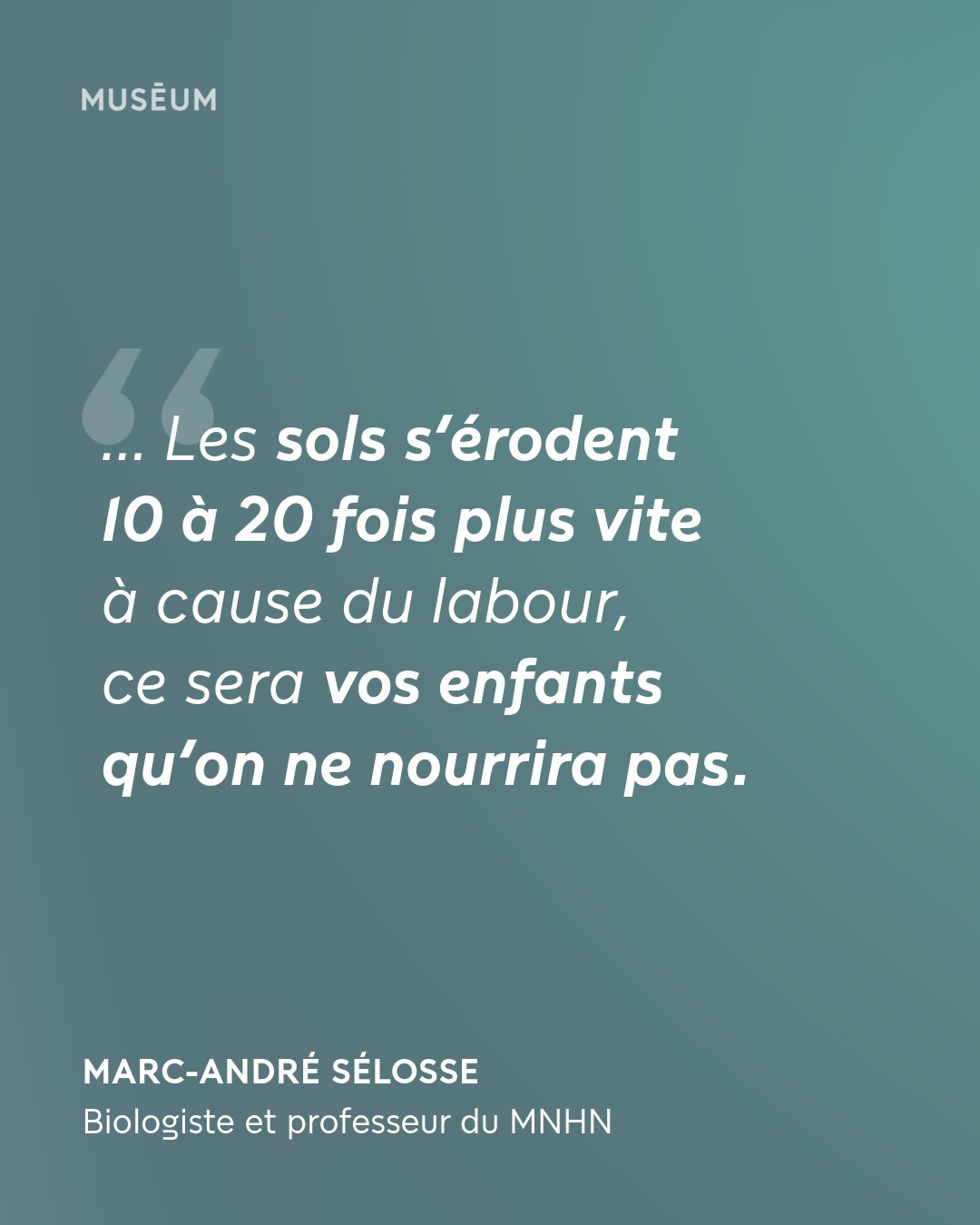 Le texte est un verbatim de Marc-André Selosse, biologiste et professeur au Muséum, issue du 2ème épisode de la saison 6 du podcast "Pour que nature vive". Le verbatim dit : "Les sols s'érodent 01 à 20 fois plus vite à cause du labour, ce sera vos enfants qu'on ne nourrira pas."