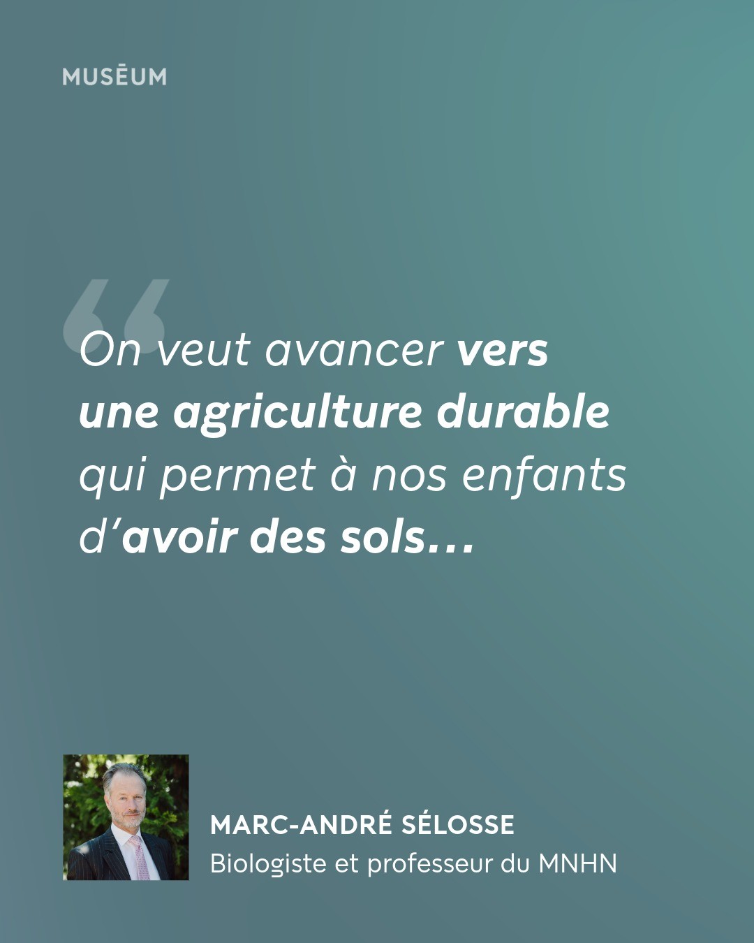 Le texte est un verbatim de Marc-André Selosse, biologiste et professeur au Muséum, issue du 2ème épisode de la saison 6 du podcast "Pour que nature vive". Le verbatim dit : "On veut avancer vers une agriculture durable qui permet à nos enfants d'avoir des sols."
