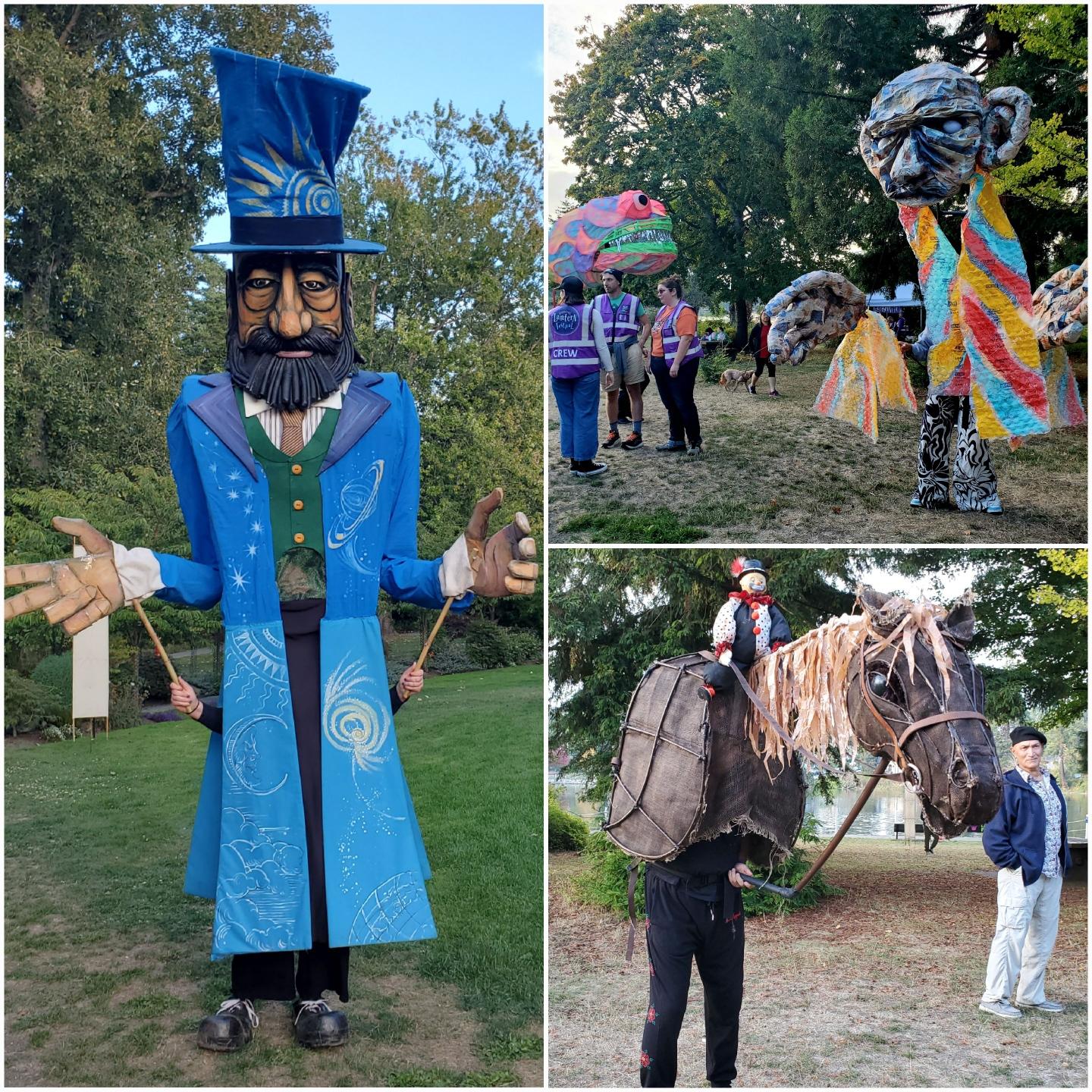 Bottom: A person wearing a frame and cloth horse costume is standing next to a man with a blue jacket. The horse is brown with a straw mane and a small plush marionette doll sits on the horse's saddle.