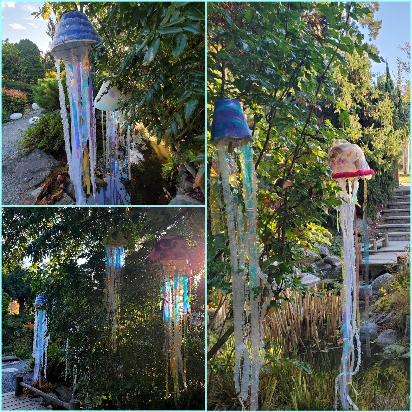 Top Right: In the background, puppet crew members conversing with people and to the right, a tall puppet with a wrinkled human face and multicolored streamers making up the clothes, the puppeteer underneath the puppet. There are other various puppets lying in the background.