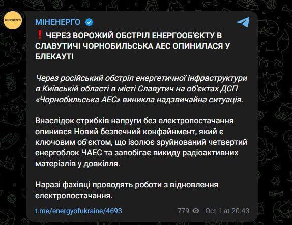 Chornobyl Nuclear Power Plant is in blackout due to a Russian strike on Kyiv region.