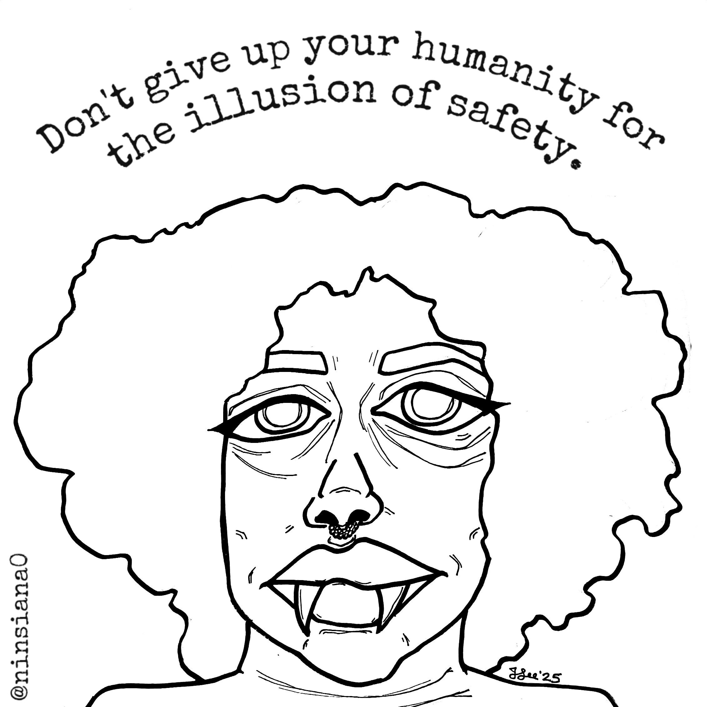 Black & white line drawing of a black femme vampire. Words read: "Don't give up your humanity for the illusion of safety."