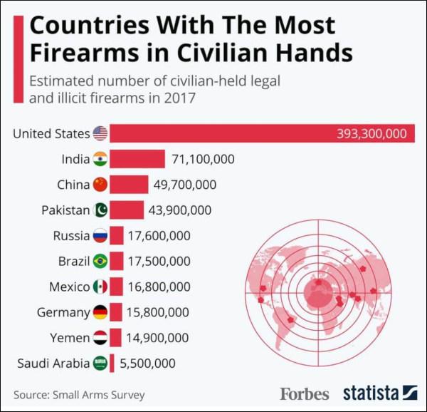 120 guns for every 100 Americans, a rate higher than any other nation. U.S. civilians own a vast majority of the world's civilian firearms, holding around 393 million out of 857 million total.