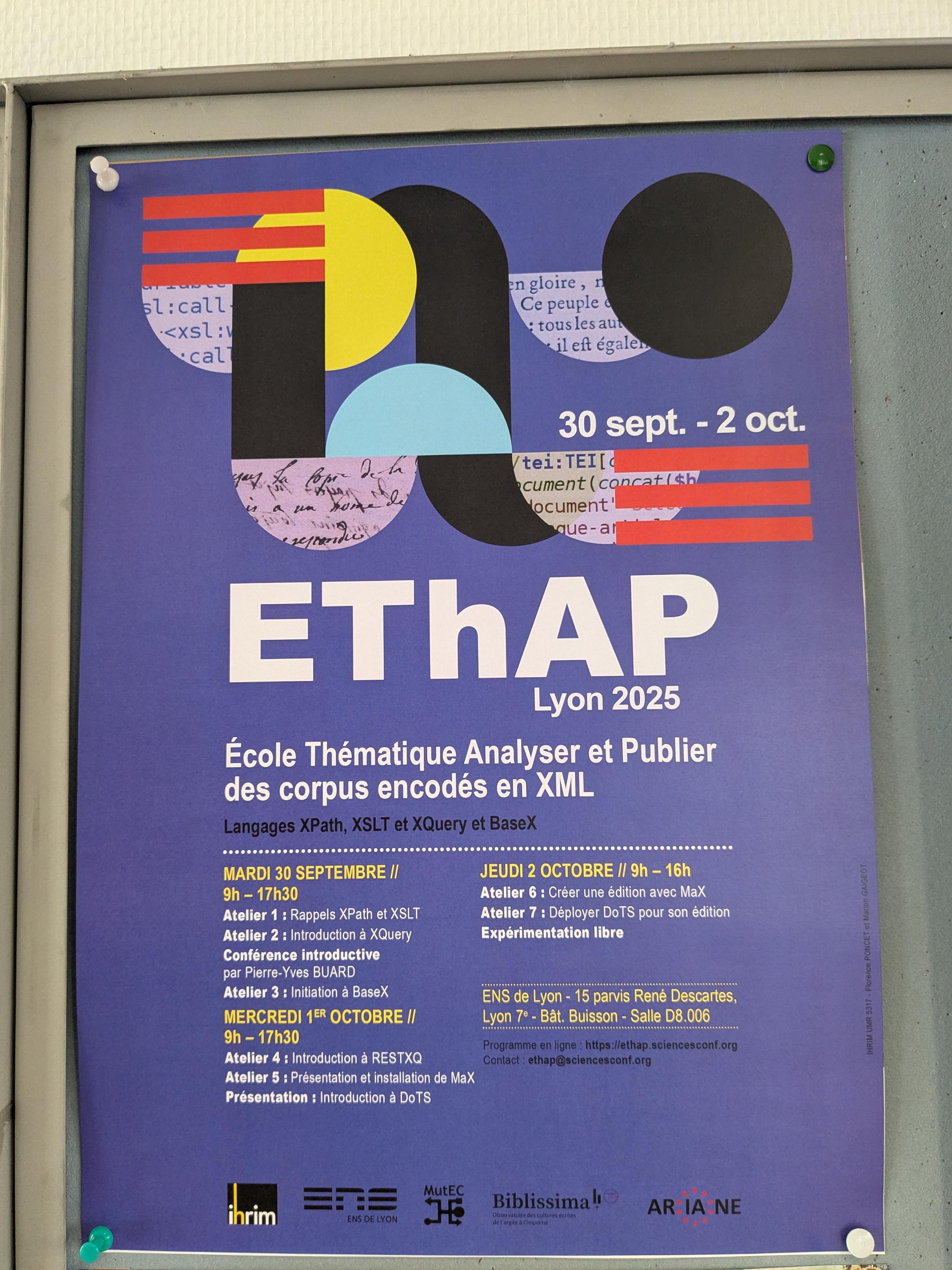 [DH] EThAP, École thématique « Analyser et publier des corpus encodés en XML », à l' @ensdelyon.bsky.social , organisée par labo #IHRIM , consortium #humanum Ariane+ et @biblissima 30sept-2oct. 🔗https://ethap.sciencesconf.org/