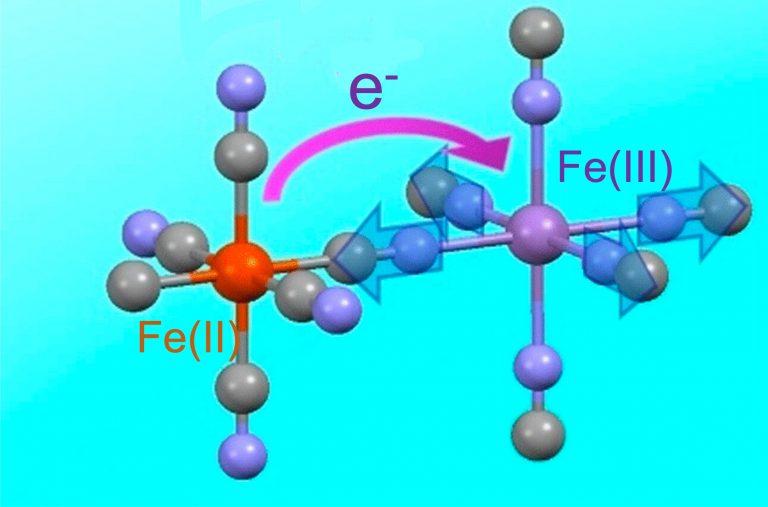 The picture shows how it works. But I don't quite get it: some irons touch 6 carbons and others touch 6 nitrogens. Is that why some are iron(II) and some are iron(III)? If no atoms move in this "intervalence charge transfer", that can't be right.