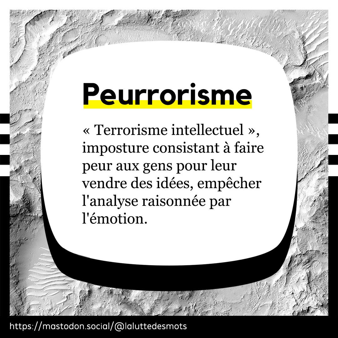 Peurrorisme : "terrorisme intellectuel", imposture consistant à faire peur aux gens pour leur vendre des idées, empêcher l'analyse raisonnée par l'émotion.