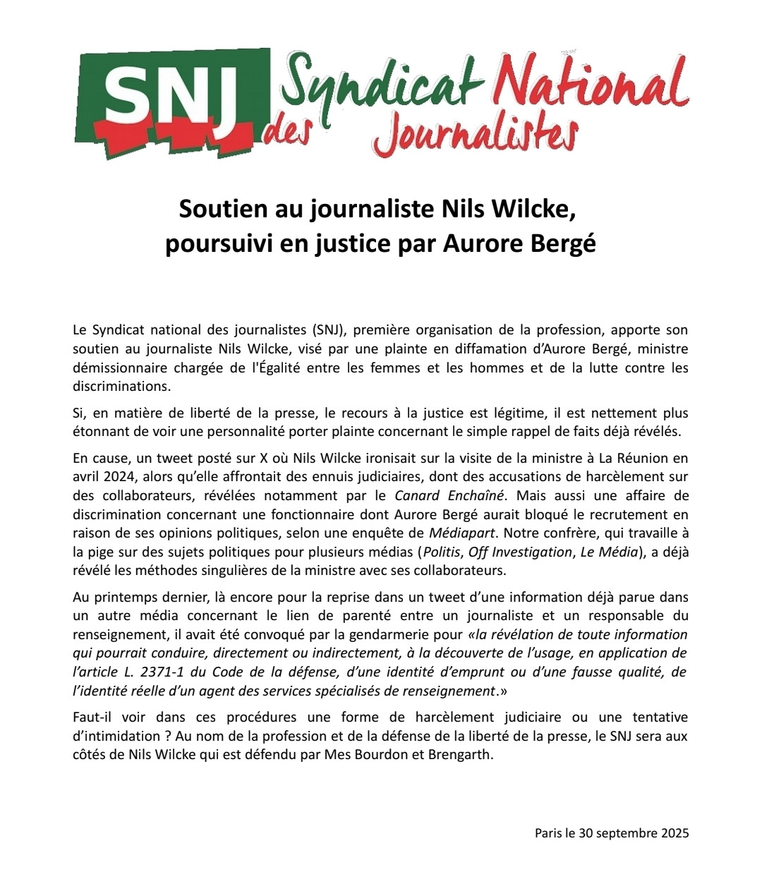 Soutien au journaliste Nils Wilcke, poursuivi en justice par Aurore Bergé Le SNJ, première organisation de la profession, apporte son soutien au journaliste Nils Wilcke, visé par une plainte en diffamation d’Aurore Bergé. Si, en matière de liberté de la presse, le recours a la justice est légitime, il est nettement plus étonnant de voir une personnalité porter plainte concernant le simple rappel de faits déja révélés. En cause, un tweet posté sur X ou Nils Wilcke ironisait sur la visite de la ministre a La Réunion en avril 2024, alors qu'elle affrontait des ennuis judiciaires, dont des accusations de harcèlement sur des collaborateurs, révélées notamment par le Canard Enchainé. Notre confrére, qui travaille a la pige sur des sujets politiques pour plusieurs médias (Politis, Off Investigation, Le Média), a déjà révélé les méthodes singulières de la ministre avec ses collaborateurs. Au printemps dernier, la encore pour la reprise dans un tweet d'une information déjà parue dans un autre média concernant le lien de parenté entre un journaliste et un responsable du renseignement, il avait été convoqué par la gendarmerie pour «la révélation de toute information qui pourrait conduire, directement ou indirectement, a la découverte de I'usage d'une identité d’emprunt ou d'une fausse qualité, de I'identité réelle d’un agent des services spécialisés de renseignement.» Harcèlement judiciaire ou tentative d’intimidation ? Paris le 30 septembre 2025