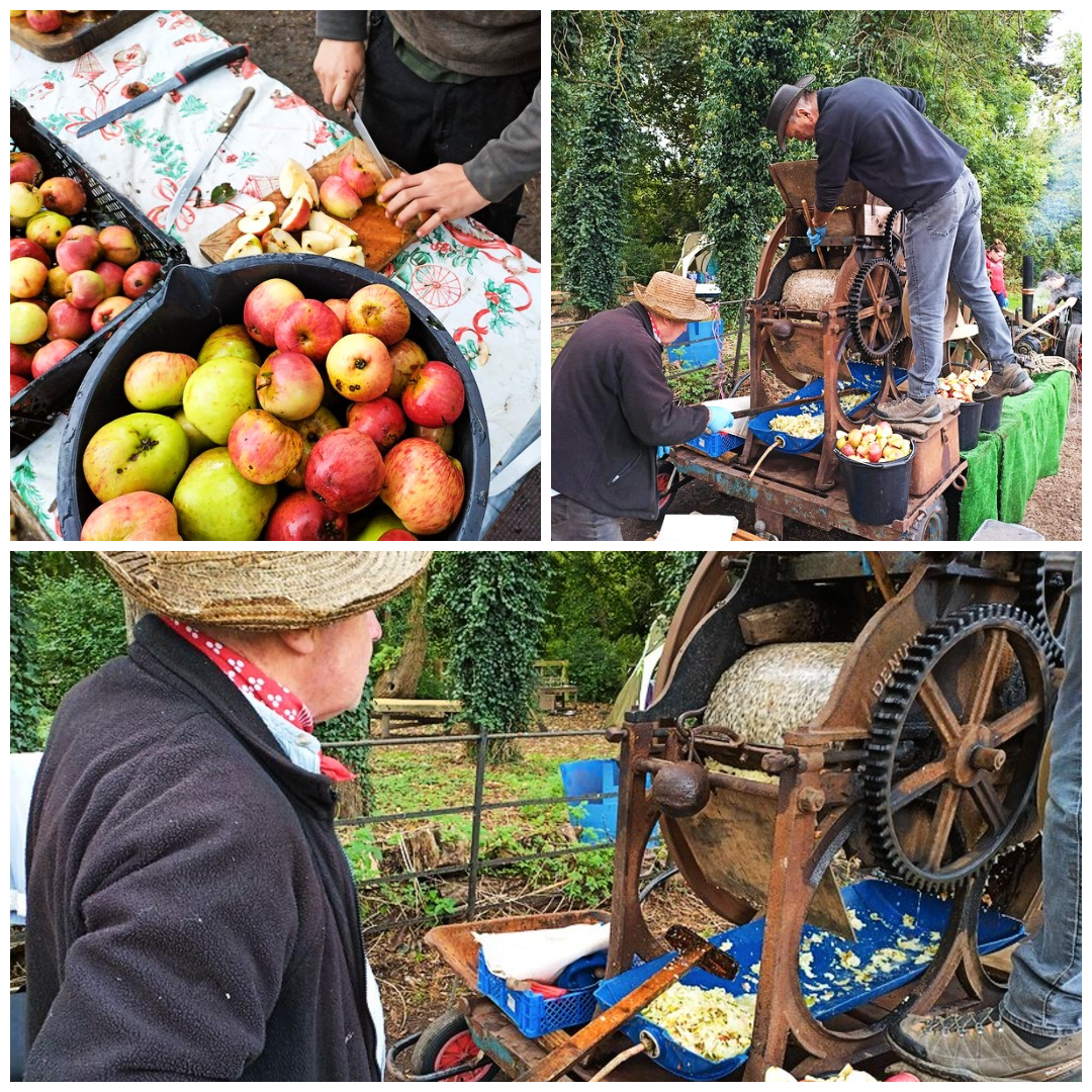 A collage of photos from previous years' Apple Days, showing the volunteers hard at work cutting apples, and working the vintage machines to crush the apples into juice. It's a great day out.