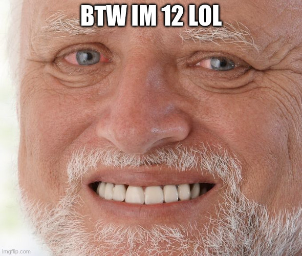 The awkward old man smiling meme, with a caption "BTW IM 12 LOL"