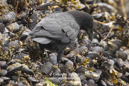 Raven foraging in a bed of mussels on the rugged coast of Vancouver Island. There were a few ravens looking for a tasty snack on this big outcrop covered by mussels as the tide was rolling in.