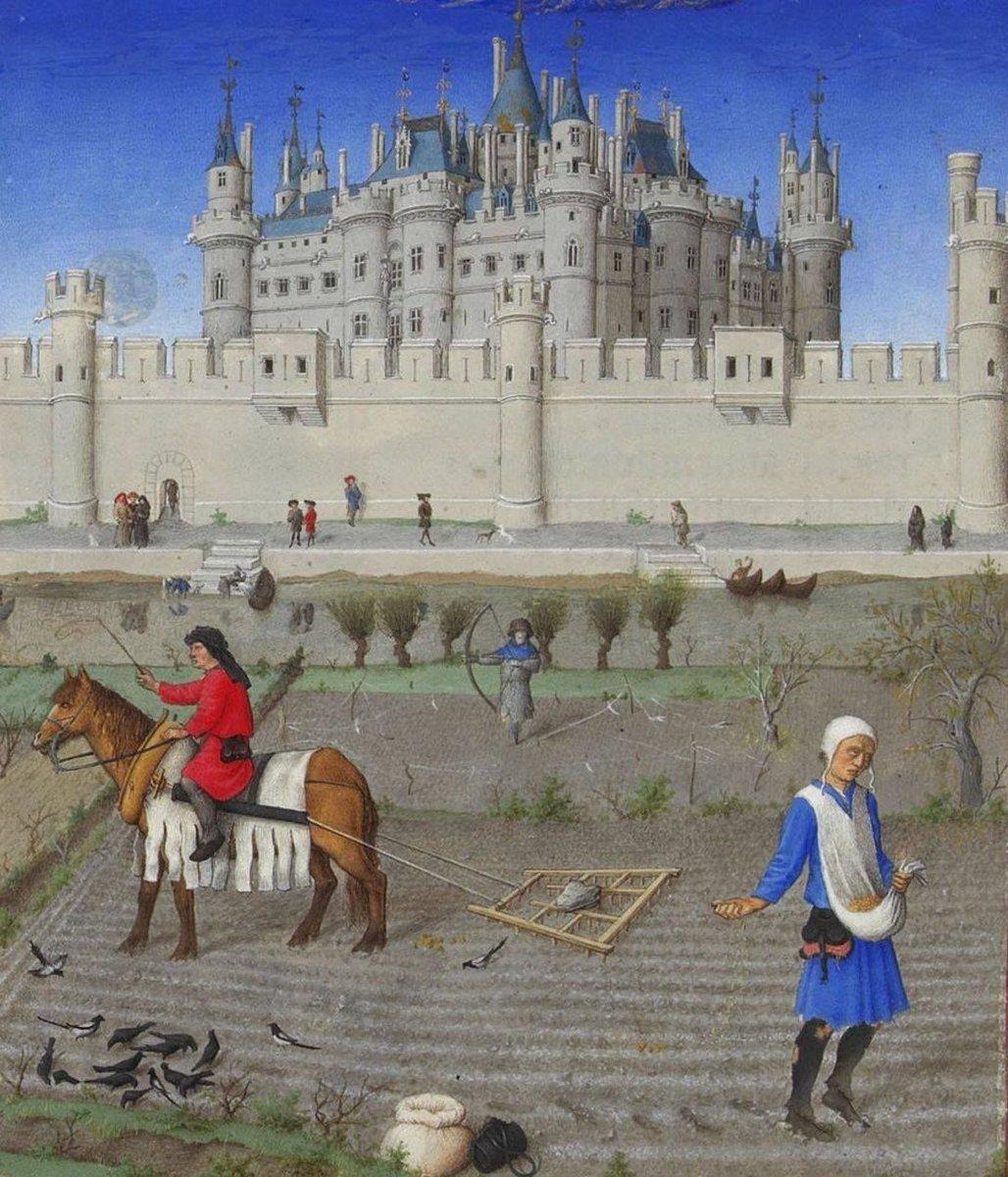 Scene representing #October, from the 15th-century Très Riches Heures — taking place at what would now be the centre of Paris (a block or two south of l'École nationale supérieure des Beaux-Arts). More here: https://publicdomainreview.org/collection/labors-of-the-months-from-the-tres-riches-heures