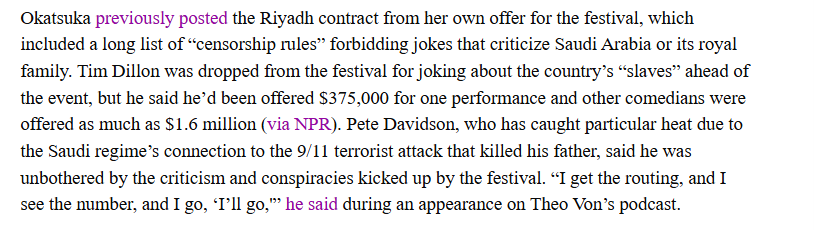 The funniest thing at the #Riyadh #Comedy #Festival, was when #TimDillion basically said something like "They (Saudi Arabia) have slaves, but they're paying me enough to overlook it."