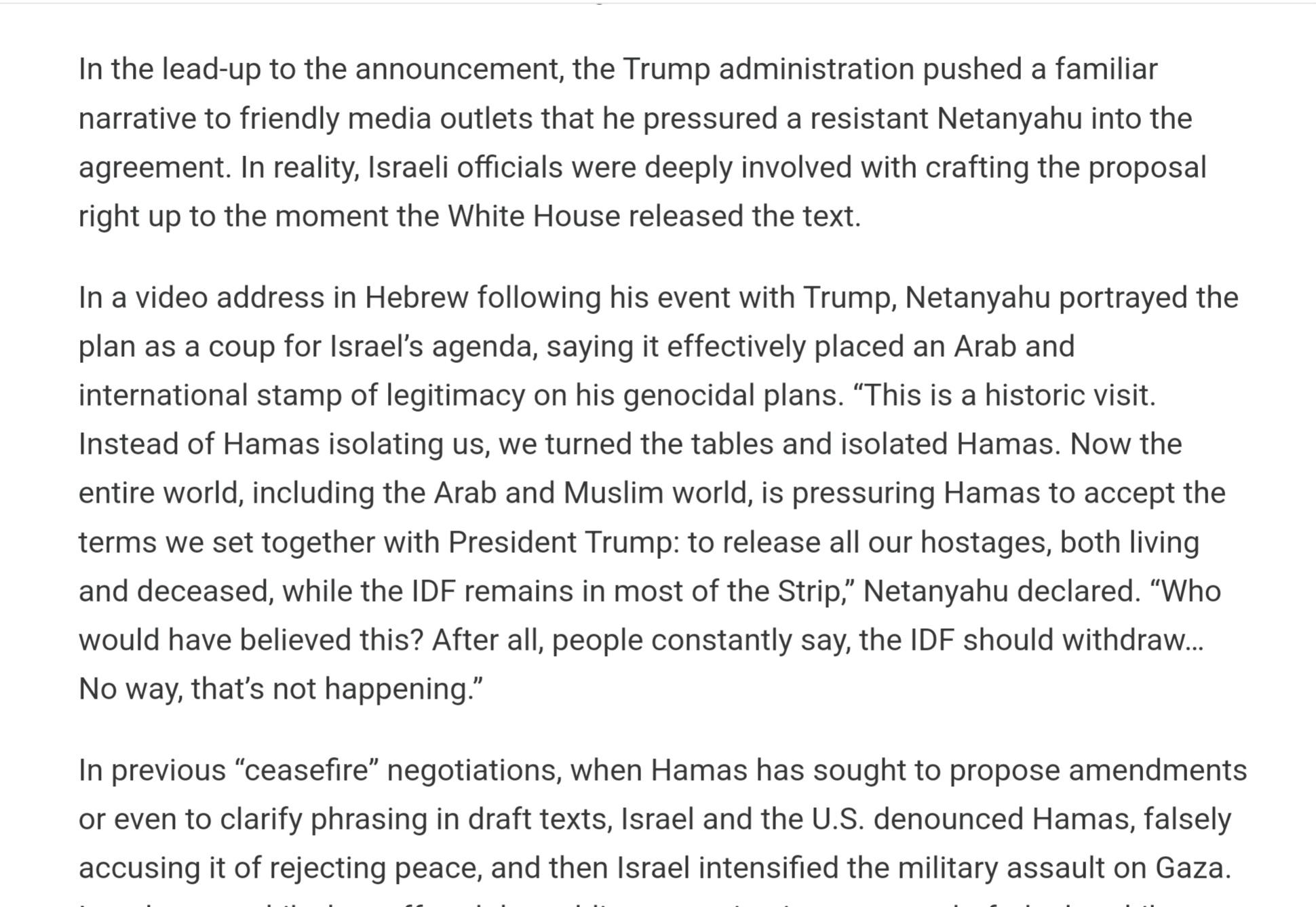 In the lead-up to the announcement, the Trump administration pushed a familiar narrative to friendly media outlets that he pressured a resistant Netanyahu into the agreement. In reality, Israeli officials were deeply involved with crafting the proposal right up to the moment the White House released the text. In a video address in Hebrew following his event with Trump, Netanyahu portrayed the plan as a coup for Israel's agenda, saying it effectively placed an Arab and international stamp of legitimacy on his genocidal plans. “This is a historic visit. Instead of Hamas isolating us, we turned the tables and isolated Hamas. Now the entire world, including the Arab and Muslim world, is pressuring Hamas to accept the terms we set together with President Trump: to release all our hostages, both living and deceased, while the IDF remains in most of the Strip,” Netanyahu declared. “Who would have believed this? After all, people constantly say, the IDF should withdraw... No way, that's not happening.” In previous “ceasefire” negotiations, when Hamas has sought to propose amendments or even to clarify phrasing in draft texts, Israel and the U.S. denounced Hamas, falsely accusing it of rejecting peace, and then Israel intensified the military assault on Gaza.