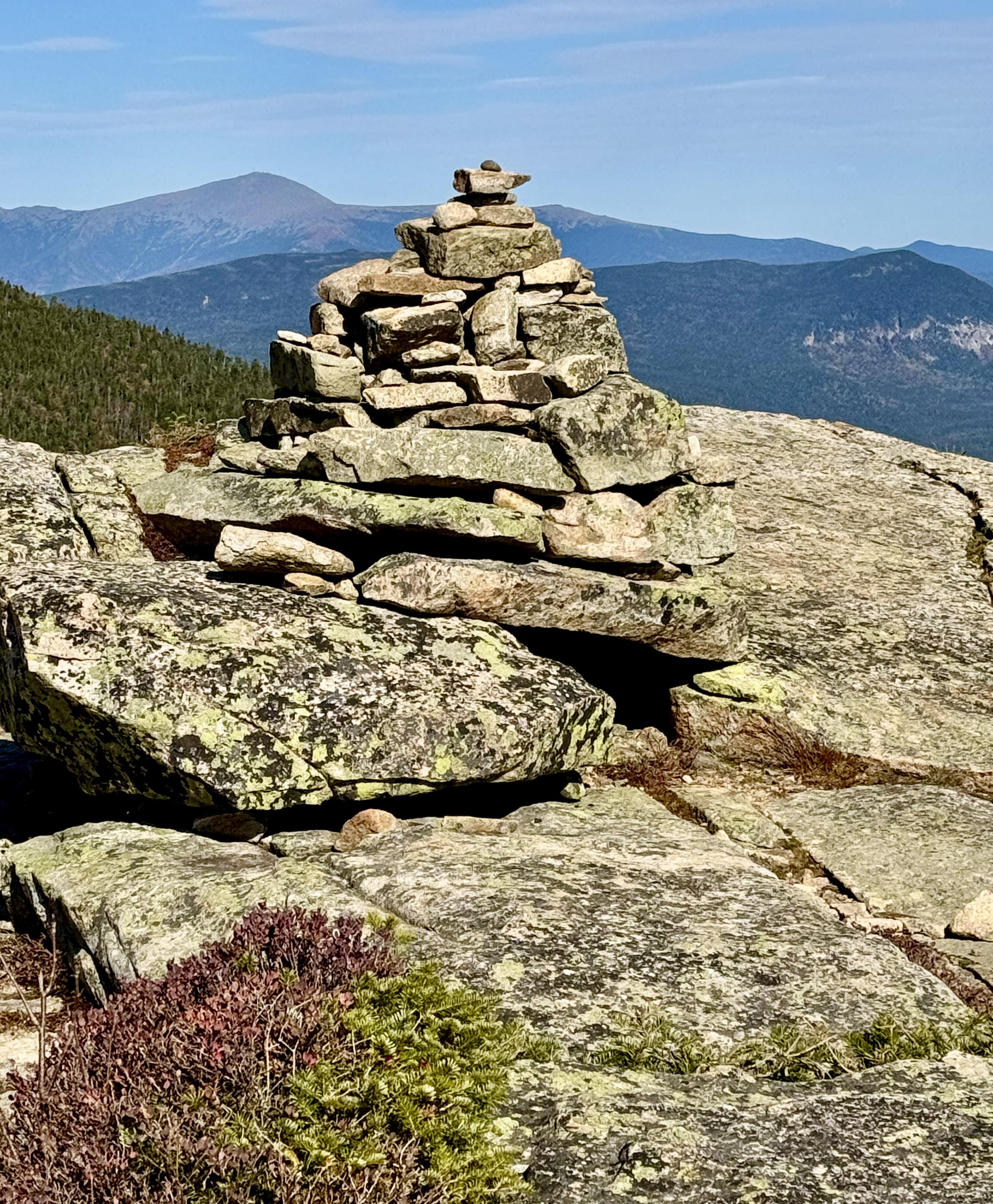 Pile of rocks (cairn) in shape of cone on rocky top of mountain. Expansive view of mountain range off in the distance. Red and green alpine vegetation in foreground. Blue sky overhead. This is the summit of Bondcliff Mountain that I hiked to two days ago on my backpacking trip to the White Mountains, New Hampshire. The highest peak in the distance is Mount Washington.