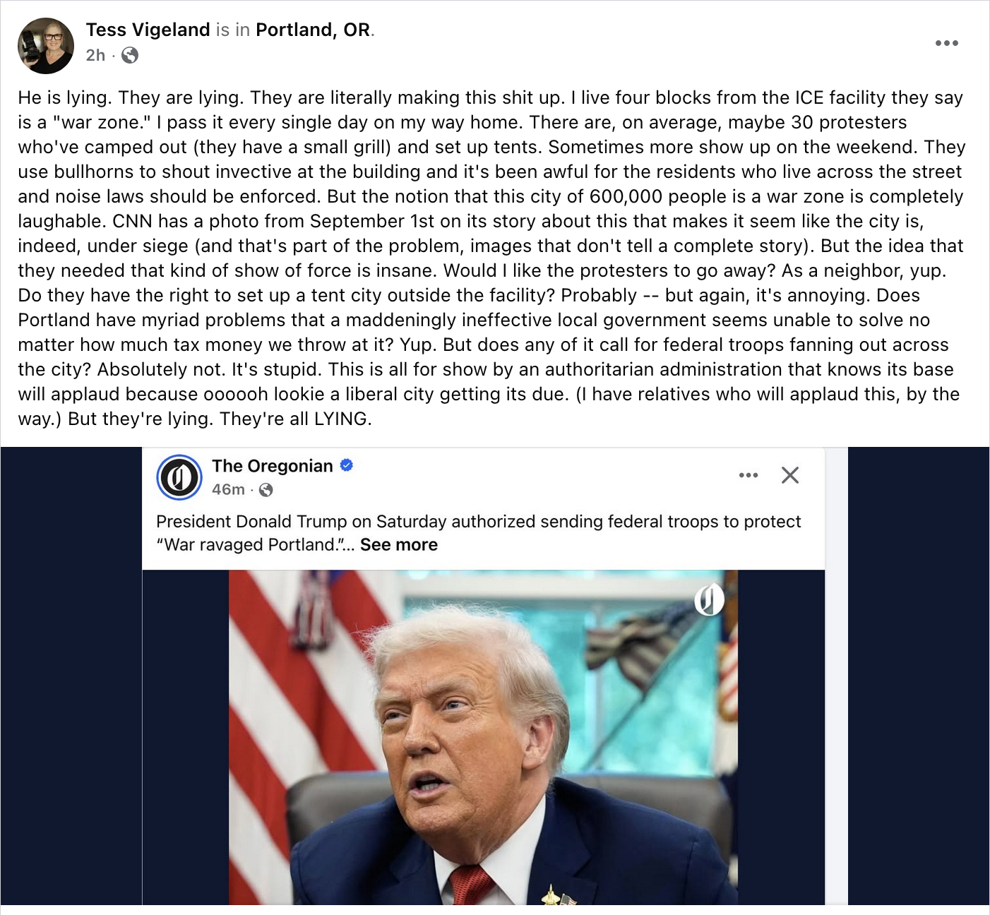 “He is lying. They are lying. They are literally making this shit up. I live four blocks from the ICE facility they say is a “war zone.” I pass it every single day on my way home. There are, on average, maybe 30 protesters who’ve camped out (they have a small grill) and set up tents. Sometimes more show up on the weekend. They use bullhorns to shout invective at the building and it’s been awful for the residents who live across the street and noise laws should be enforced. But the notion that this city of 600,000 people is a war zone is completely laughable. CNN has a photo from September 1st on its story about this that makes it seem like the city is, indeed, under siege (and that’s part of the problem, images that don’t tell a complete story). But the idea that they needed that kind of show of force is insane. Would I like the protesters to go away? As a neighbor, yup. Do they have the right to set up a tent city outside the facility? Probably — but again, it’s annoying. Does Portland have myriad problems that a maddeningly ineffective local government seems unable to solve no matter how much tax money we throw at it? Yup. But does any of it call for federal troops fanning out across the city? Absolutely not. It’s stupid. This is all for show by an authoritarian administration that knows its base will applaud because oooooh lookie a liberal city getting its due. (I have relatives who will applaud this, by the way.) But they’re lying. They’re all LYING.”