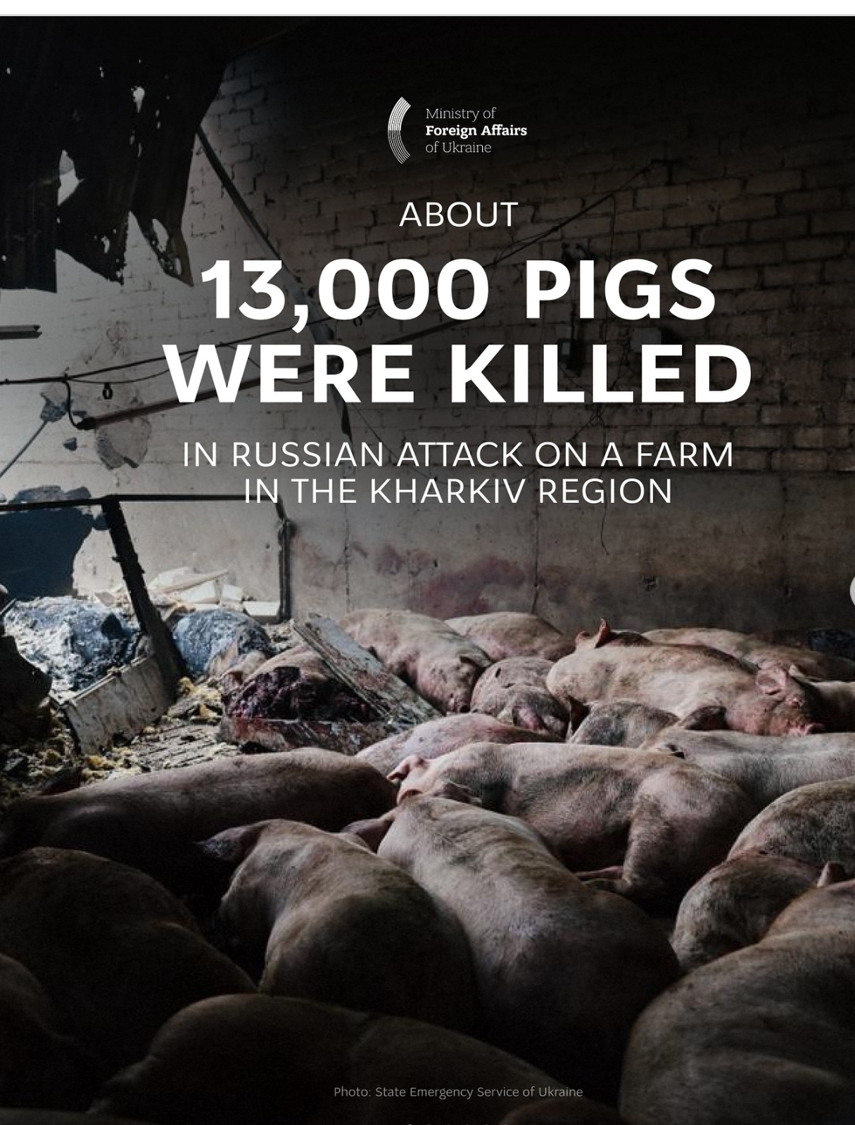 Ministry of Foreign Affairs of Ukraine Russian attack on Fram 13,000 PIGS WERE KILLED IN RUSSIAN ATTACK ON A FARM IN THE KHARKIV REGION Photo: State Emergency Service of Ukraine
