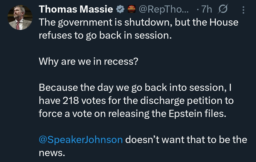 Thomas Massie @RepTho ... . 7h The government is shutdown, but the House refuses to go back in session. Why are we in recess? Because the day we go back into session, I have 218 votes for the discharge petition to force a vote on releasing the Epstein files. SpeakerJohnson doesn't want that to be the news. #ReleaseTheEpsteinFiles