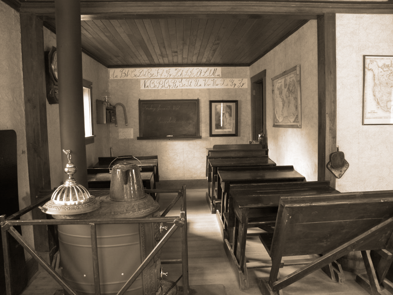 Ein Schwarzweißfoto zeigt das Innere eines Klassenzimmers. Mehrere Reihen von Holzbänken stehen vor einer dunklen Tafel. An der vorderen Wand befinden sich zwei gerahmte Bilder. Vorne steht ein hölzerner Lehrerpult mit zwei Glocken. Der Boden besteht aus Holz und die Wände sind blass. Ein eiserner Holzofen links ist prominent im Bild m