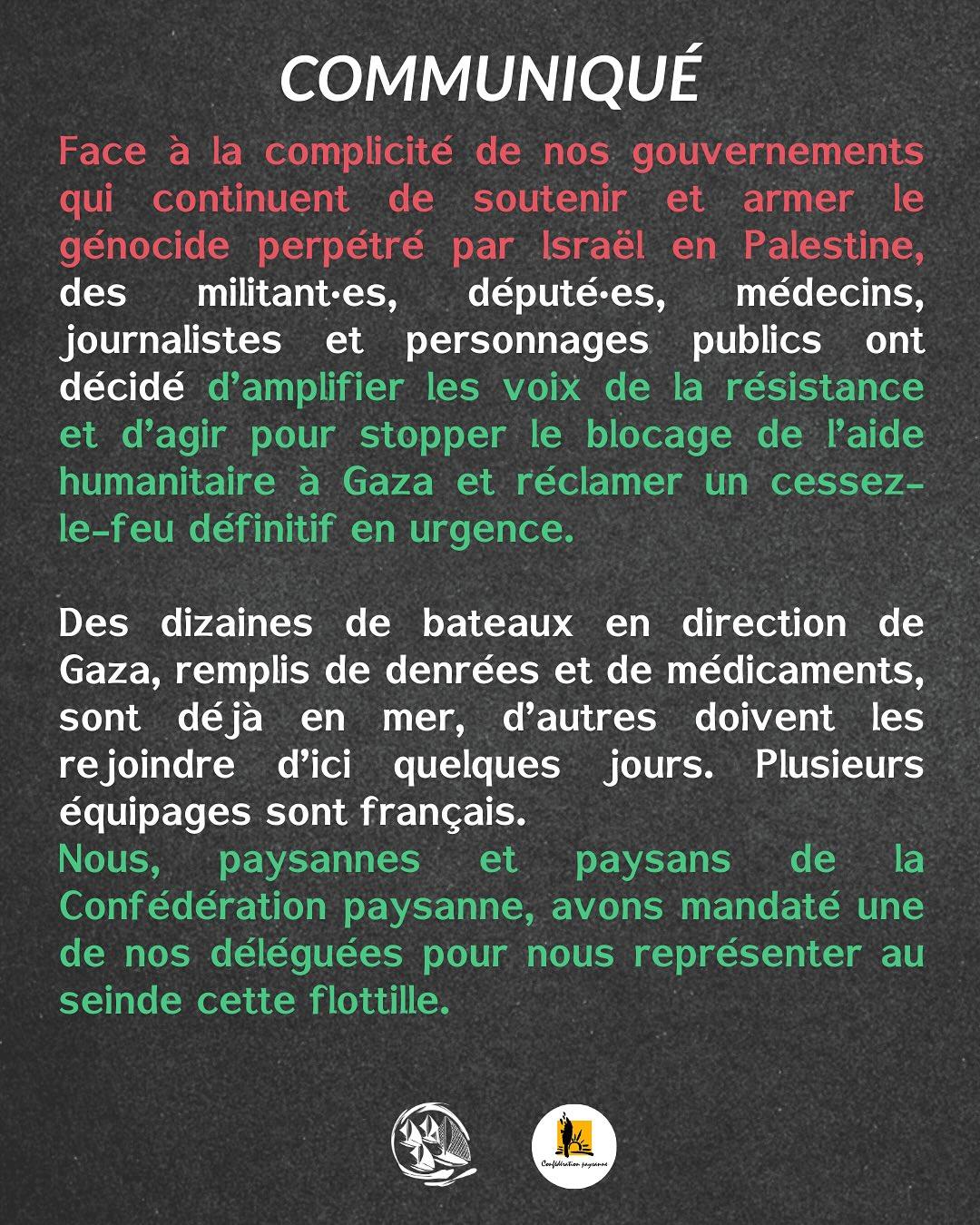 Texte blanc vert et rouge sur fond gris COMMUNIQUE Face a la complicité de nos gouvernements qui continuent de soutenir et armer le génocide perpétré par Israél en Palestine, des militant-es, député-es, médecins, journalistes et personnages publics ont décidé d’amplifier les voix de la résistance et d’agir pour stopper le blocage de l'aide humanitaire a Gaza et réclamer un cessez- le-feu définitif en urgence. Des dizaines de bateaux en direction de Gaza, remplis de denrées et de médicaments, sont déja en mer, d’autres doivent les rejoindre d’ici quelques jours. Plusieurs équipages sont francais. Nous, paysannes et paysans de Ia Confédération paysanne, avons mandaté une de nos délégueées pour nous représenter au sein de cette flottille.