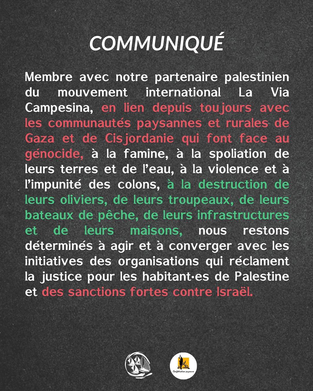 COMMUNIQUE Membre avec notre partenaire palestinien du mouvement international La Via Campesina, en lien depuis toujours avec les communautés paysannes et rurales- de Gaza et de Cisjordanie qui font face au genocide, a la famine, a la spoliation de leurs terres et de l'eau, a la violence et a l'impunité des colons, a la destruction de leurs oliviers, de leurs troupeaux, de leurs bateaux de péche, de leurs infrastructures et de leurs maisons, nous restons déterminés a agir et a converger avec les initiatives des organisations qui réclament la justice pour les habitant-es de Palestine et des sanctions fortes contre Israél.