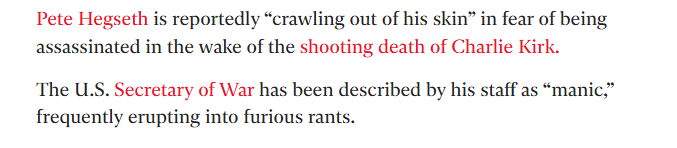 Pete Hegseth is reportedly “crawling out of his skin” in fear of being assassinated in the wake of the shooting death of Charlie Kirk. ‘The U.S. Secretary of War has been described by his staff as “manic,” frequently erupting into furious rants.