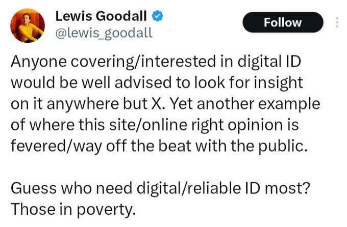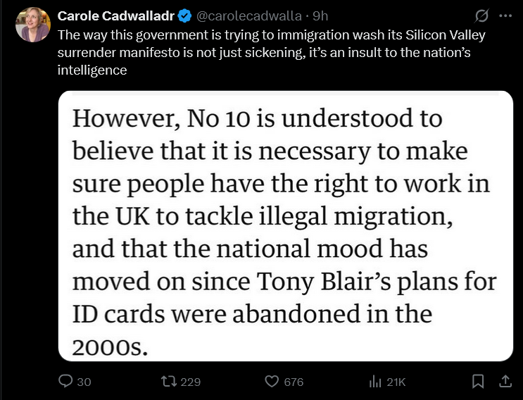 Two Bluesky posts by Zarah Sultana MP at 25 September 2025 at 19:03 Labour's plan for compulsory digital ID risks creating a more authoritarian state. Under constant surveillance, we would have to pass through digital checkpoints just to live our daily lives β€” with even more barriers for minorities, migrants and the digitally excluded. --- Tony Blair tried this 20 years ago. We stopped it then, and we must stop it again.