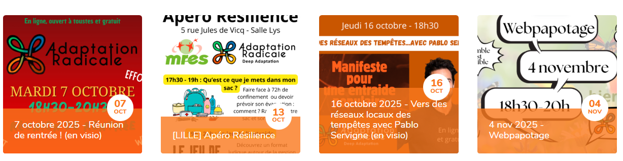 7 octobre 2025 - Réunion de rentrée ! (en visio) 13 Octobre à Lille - Apéro Résilience 16 octobre 2025 - Vers des réseaux locaux des tempêtes avec Pablo Servigne (en visio) 4 nov 2025 - Webpapotage