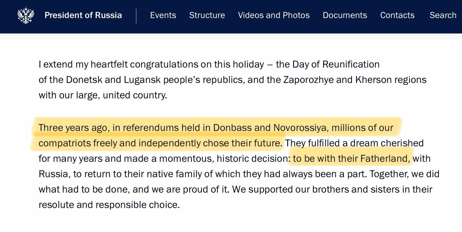 In last night’s speech, Putin apparently hoped that after three years, no one remembers how people were held at gun point in their own homes to vote or else, and he now describes his 2022 “referendum” in the occupied parts of Ukraine as people “freely and independently” choosing “to be with the fatherland.
