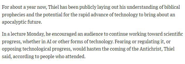 Peter Thiel is giving a series of lectures on the biblical Antichrist, organized by the Acts 17 Collective. “Acts” stands for “Acknowledging Christ in Technology and Society”.