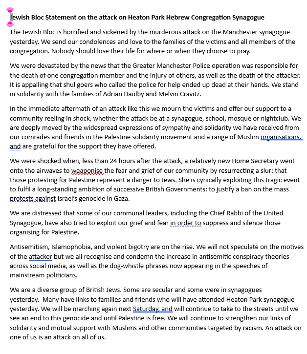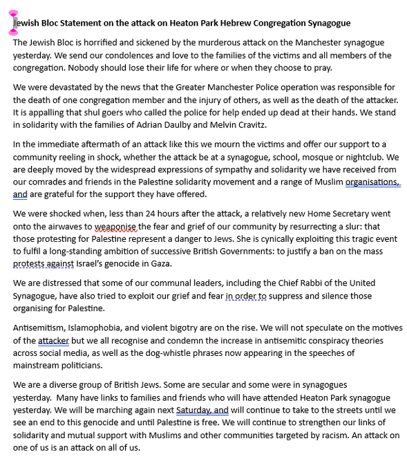 itis appalling that shul goers who called the police for help ended up dead at their hands. We stand in solidarity with the families of Adrian Daulby and Melvin Cravitz in the immediate aftermath of an attack like this we mourn the victims and offer our support to a community reeling in shock, whether the attack be at a synagogue, school, mosque or nightclub. We are deeply moved by the widespread expressions of sympathy and solidarity we have received from our comrades and friends in the Palestine solidarity movement and a range of Muslim organisations.