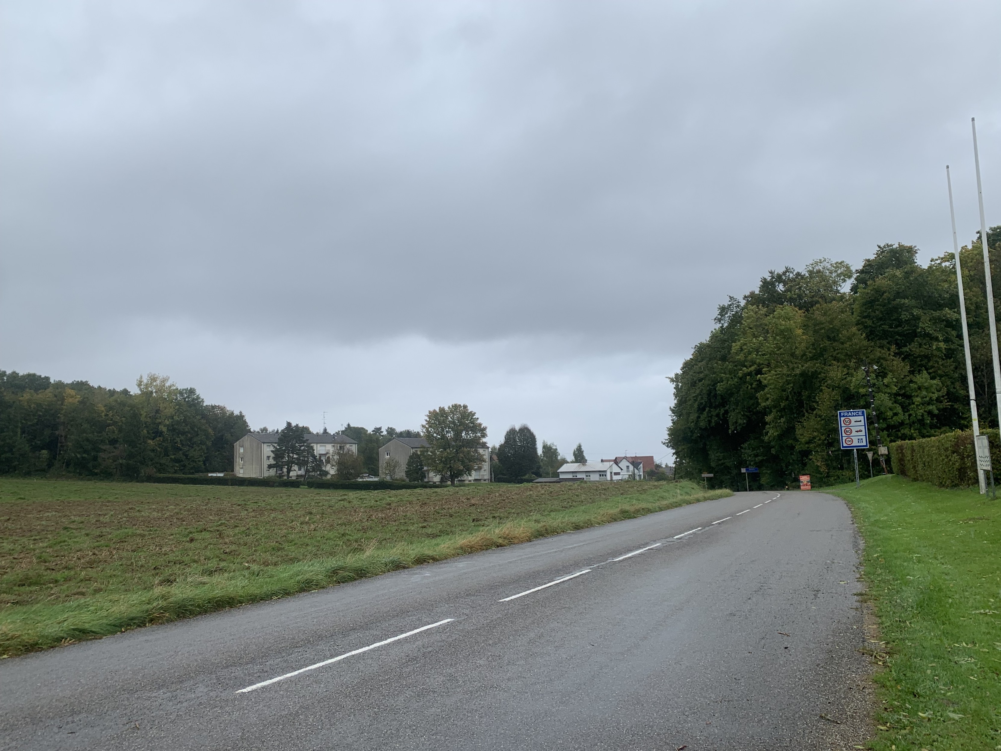 Am Grenzübergang Beurnevésin vorbei geht es weiter. Das alte #Zollhaus ist übrigens bewohnt. Auf der französischen Seite fallen Wohnblöcke auf, welche für mich ein einem sundgauer Dorf ziemlich unerwartet rumstehen - im Franzuntericht hatten wir es mal von den „HLM“, ob das so etwas ist? Vorbei am Fussballplatz von Pfetterhouse kommt man dann an einen weiteren „Dreiländerstein“.