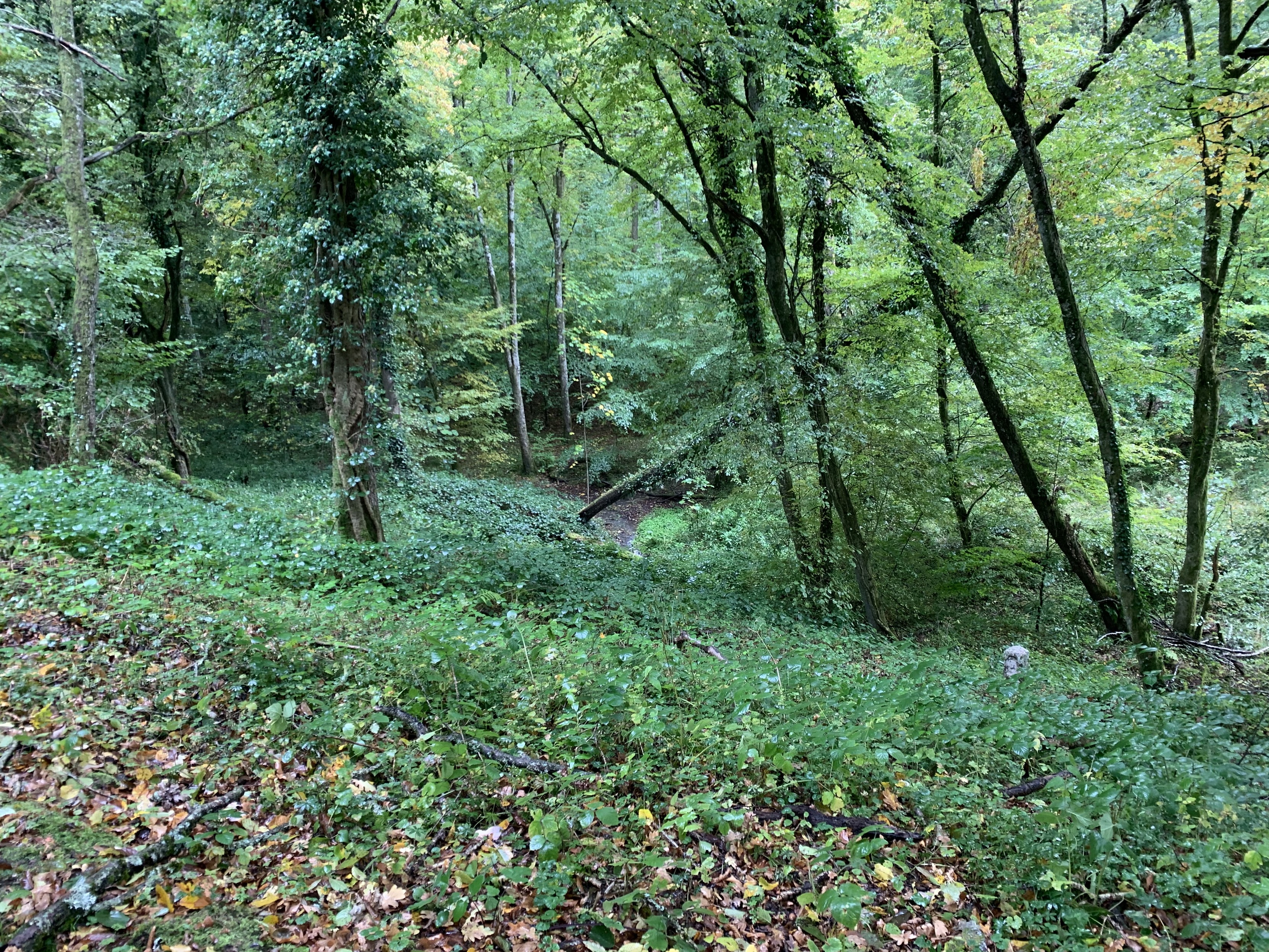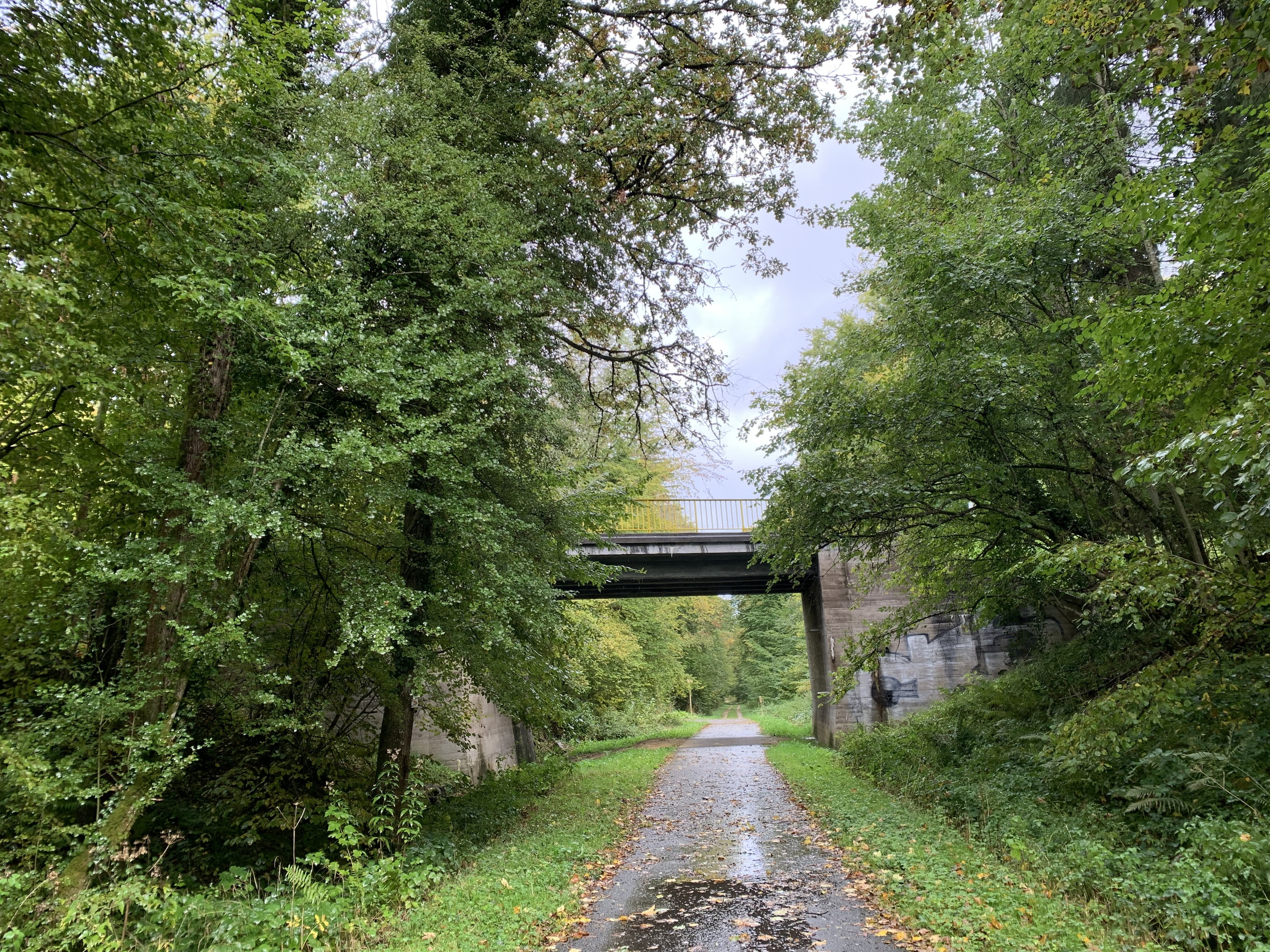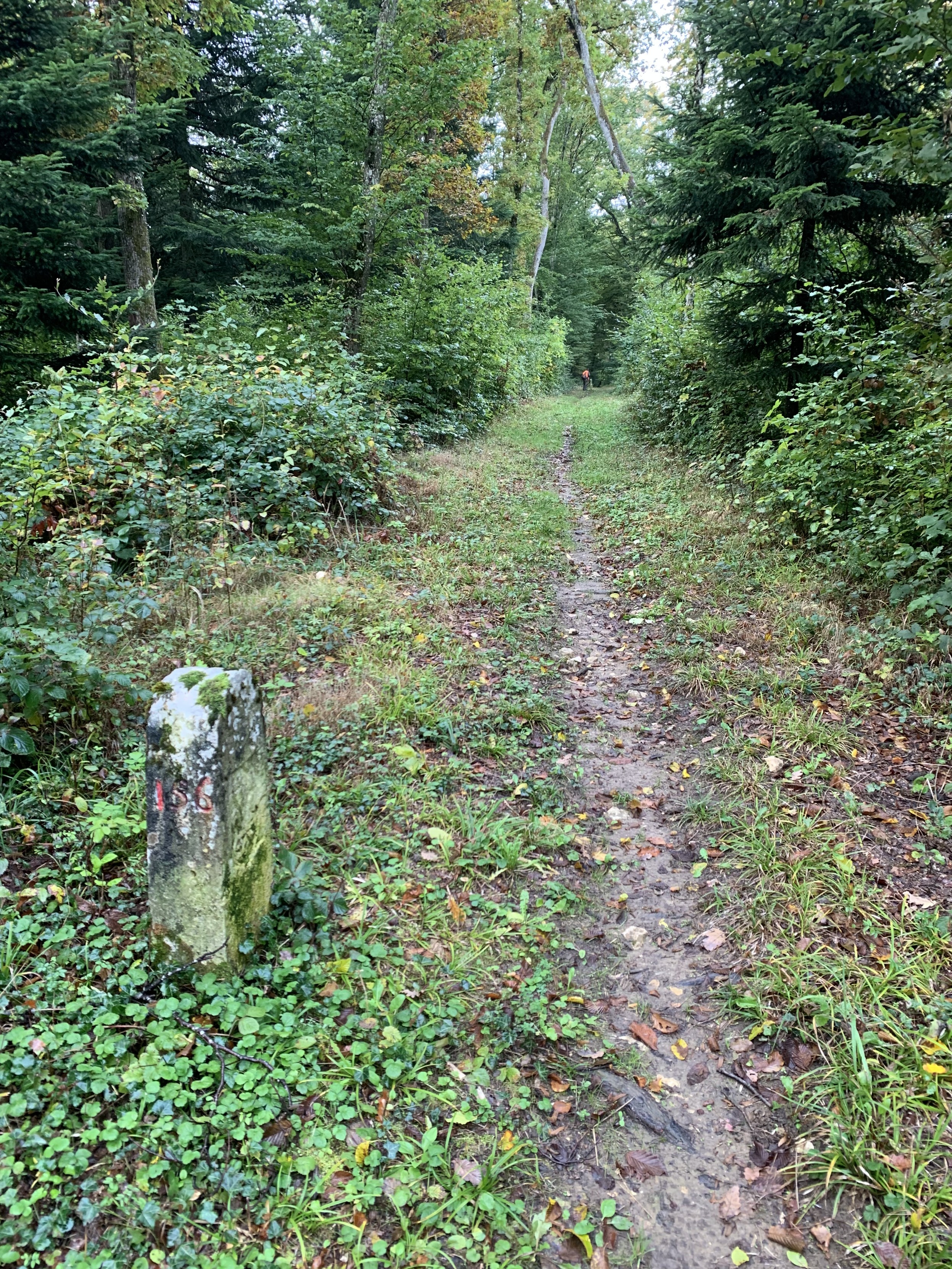 Irgendwann trifft man dann auf die alte Eisenbahntrasse Bonfol-Dannemarie, das nun zu einem - tataa - #Veloweg umgebaut wurde. Das war offenbar ziemlich aufwändig angelegt. Der Damm ist im (neugewachsenen?) Wald nur schwer wahrzunehmen, aber der Einschnitt ist offensichtlich. Die Grenzsteine sind nun teilweise ziemlich banal.