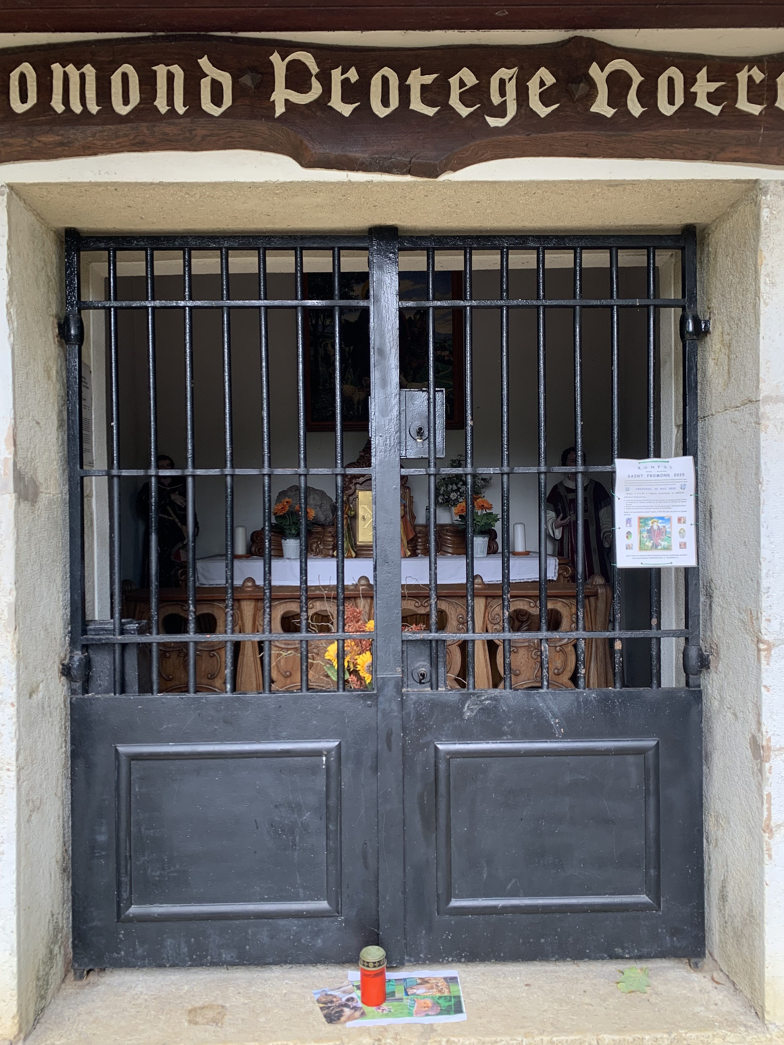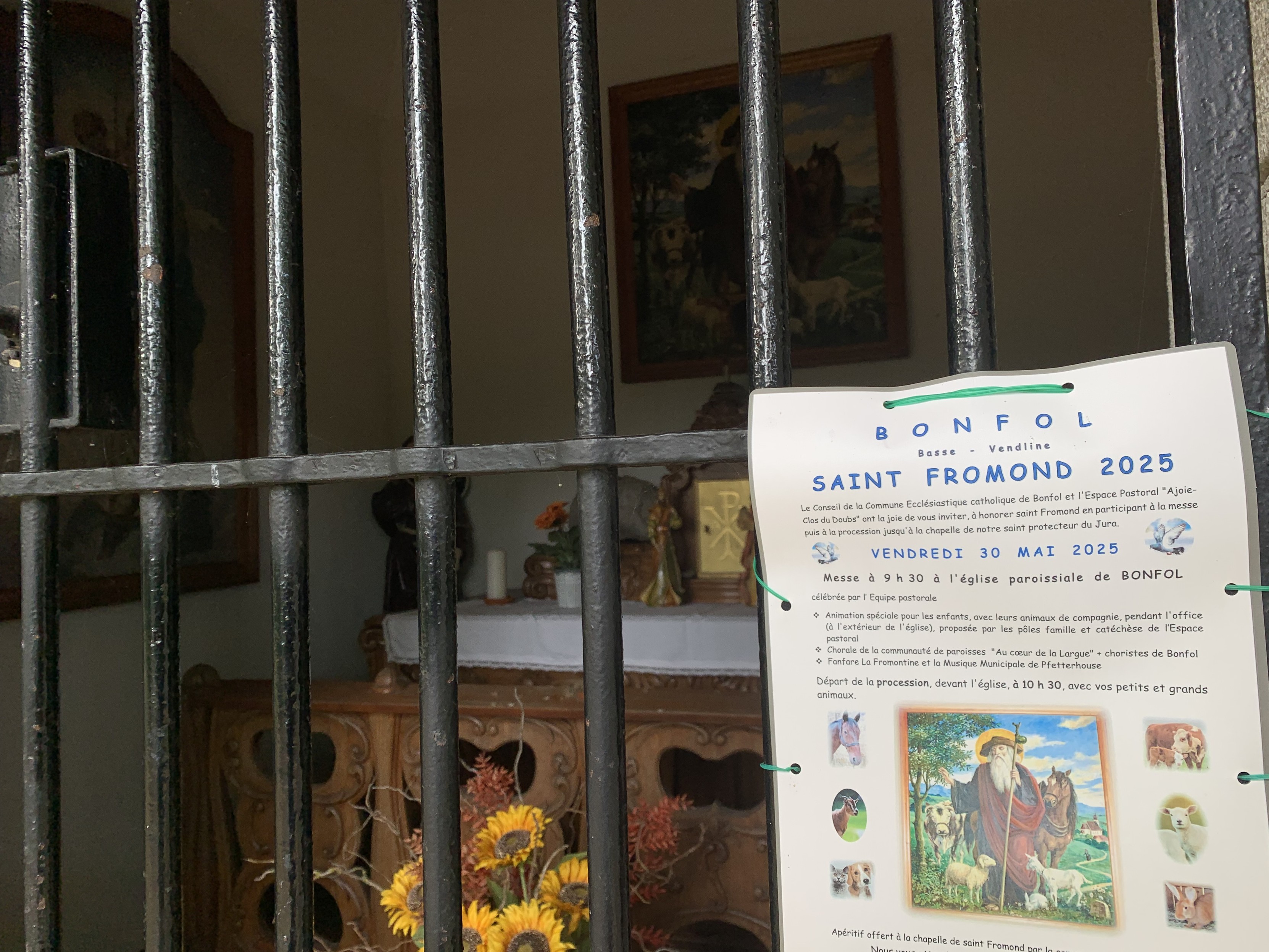 Ja, man ist erzkatholisch - der heilige Fromont lebte zur Zeit von St. Ursanne und war offenbar für die Tiere zuständig, wie die Einladung, seine (Haus-)Tiere zur Prozession mitzubringen, bekräftigt (und die auf der Stufe deponierten Fotos der offenbar verstorbenen Katze).