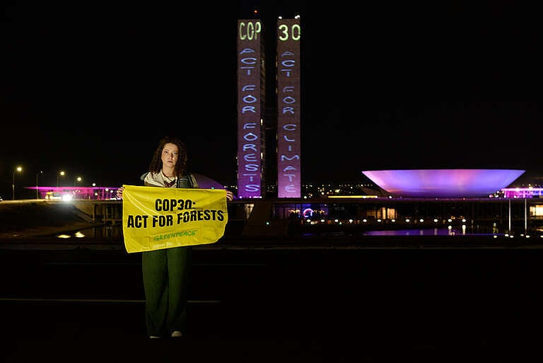 Greenpeace Brazil has projected messages to country delegates at the Pre-COP in Brasilia calling for urgent action to end forest destruction as a new Greenpeace International’s poll showed nine out of 10 people surveyed want forests protected to fight climate change