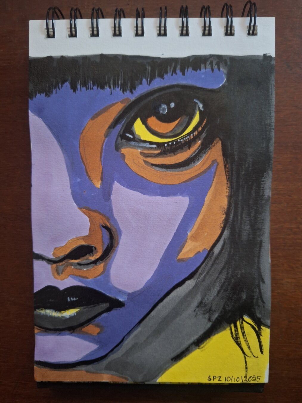 Close-up portrait of a face painted in violet, ochre, and black. The composition focuses on one large, intense eye glowing with yellow and orange hues, framed by dark lashes and a sharp fringe of black hair. The expression is unreadable โ half sorrow, half quiet strength โ as if caught between shadow and light.