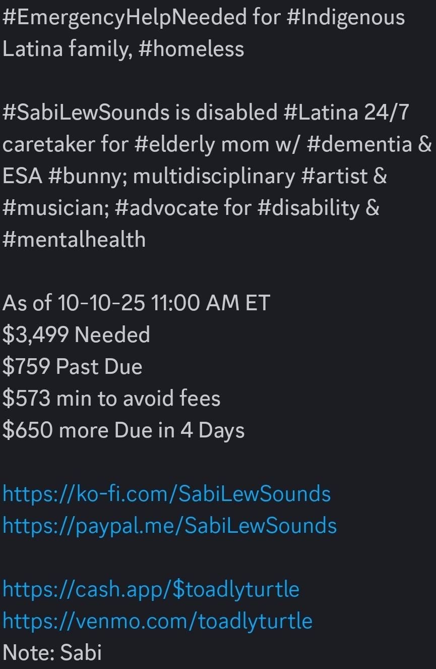 #EmergencyHelpNeeded for #Indigenous Latina family, #homeless #SabiLewSounds is disabled #Latina 24/7 caretaker for #elderly mom w/ #dementia & ESA #bunny; multidisciplinary #artist & #musician; #advocate for #disability & #mentalhealth As of 10-10-25 11:00 AM ET $3,499 Needed $759 Past Due $573 min to avoid fees $650 more Due in 4 Days https://Ko-fi.com/SabiLewSounds https://PayPal.me/SabiLewSounds https://cash.app/$toadlyturtle https://venmo.com/toadlyturtle Note: Sabi