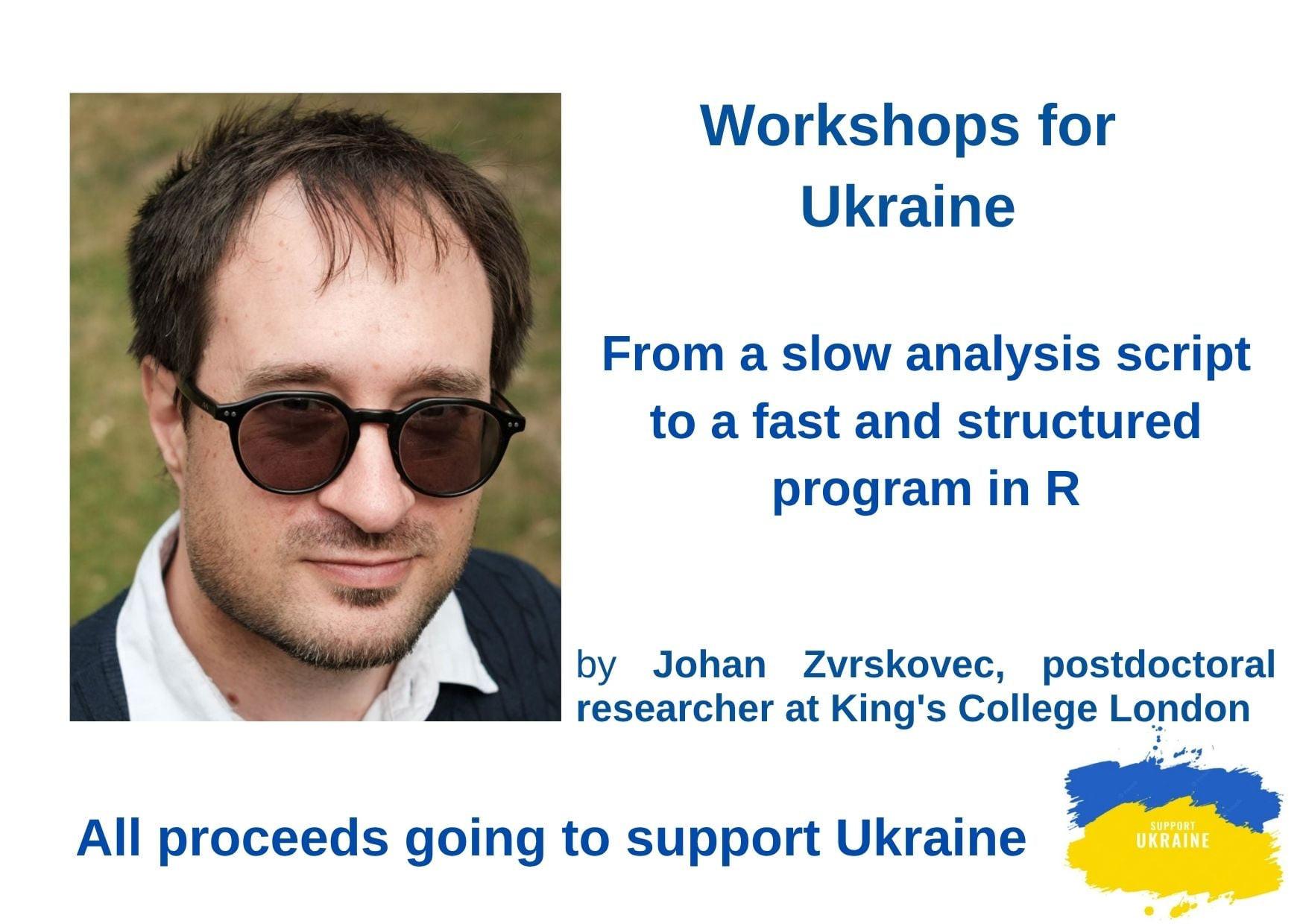 This week at #WorkshopsForUkraine: " From a slow analysis script to a fast and structured program in #R #Rstats" by Johan Zvrskovec (King's College London), Thursday, October 9th, 6 pm CEST. Register or sponsor a place for a student by donating to support #Ukraine. You can also donate to get recordings and all of the materials of the previous workshops. Details: https://sites.google.com/view/dariia-mykhailyshyna/main/r-workshops-for-ukraine#h.5w7qmxl591m0