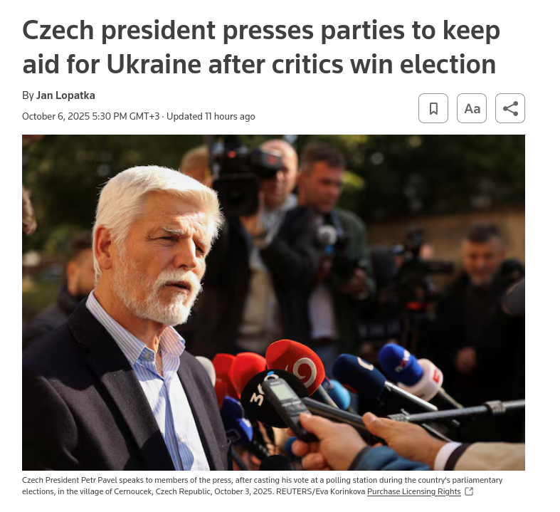 The Czech president pressed political parties on Monday to maintain an ammunition supply programme for Ukraine against Russia's invasion following the election victory of a populist party that has pledged to scrap the scheme.