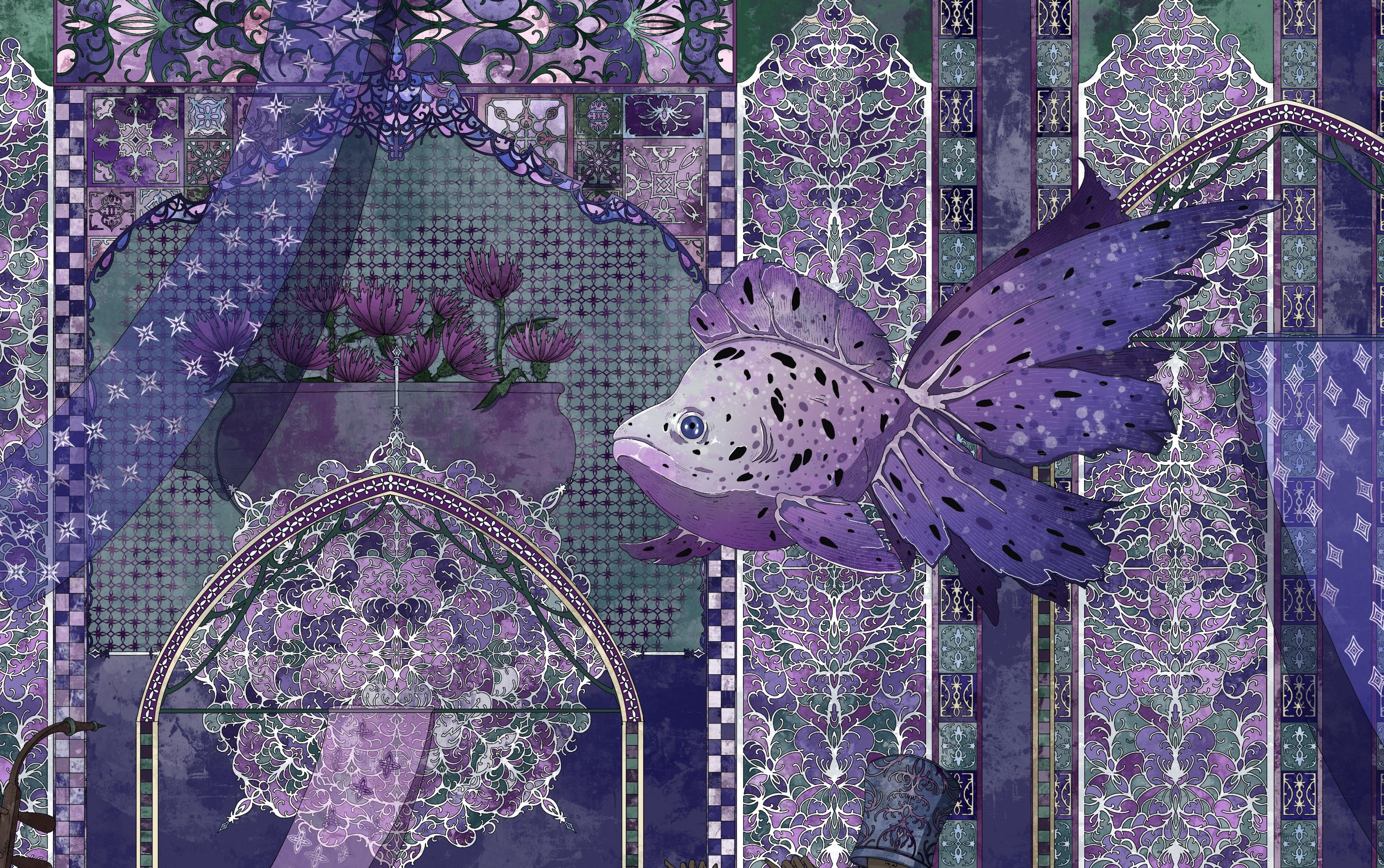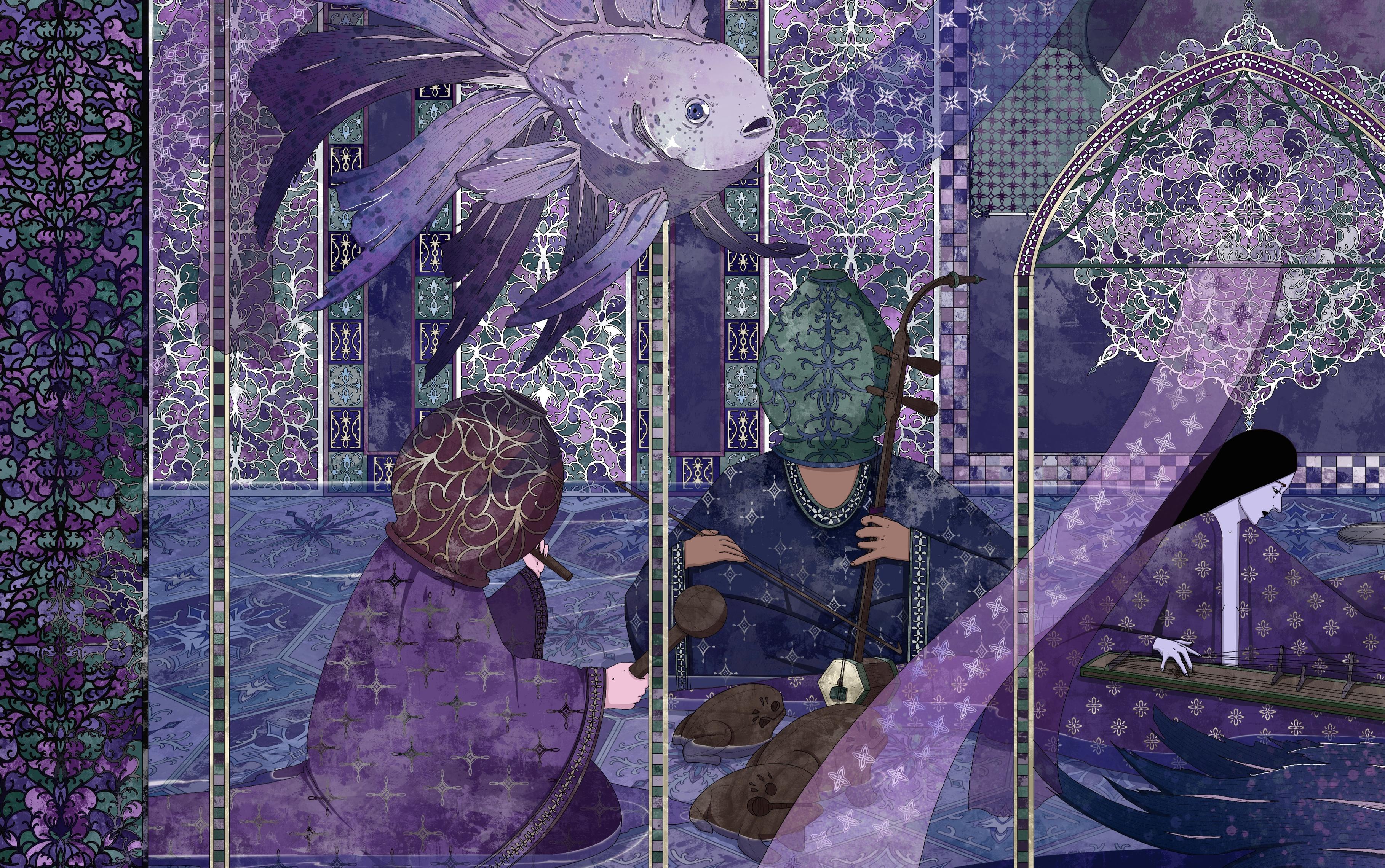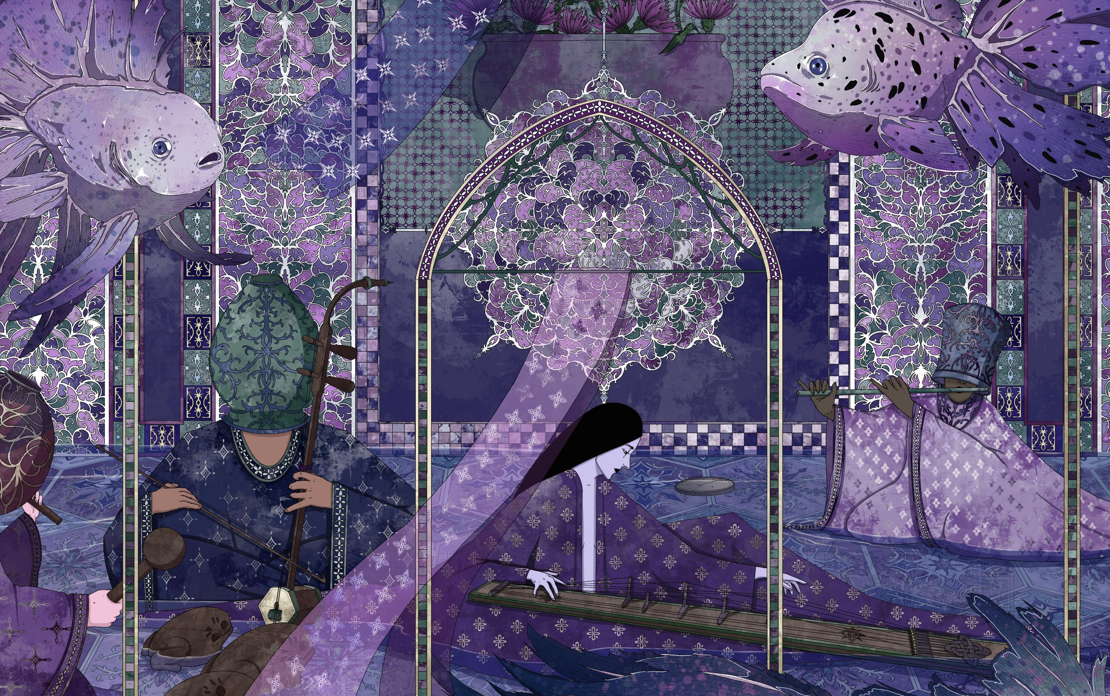 The artwork shows musicians sitting in shallow water in a purple room. First musician plays wooden drums, second one plays erhu, third one plays a flute, fourth one plays a gong. All background musicians wear either pots or plates on their heads. The woman in the center has black hair and plays an instrument inspired by Korean instrument called gayageum. There are three purple goldfish floating above the ground. The wall in the background is decorated with arches with stained glass and there's a big flower pot with purple cornflowers. The room also has some arches with silk fabric hanging on them. The artwork is purple with some green details.