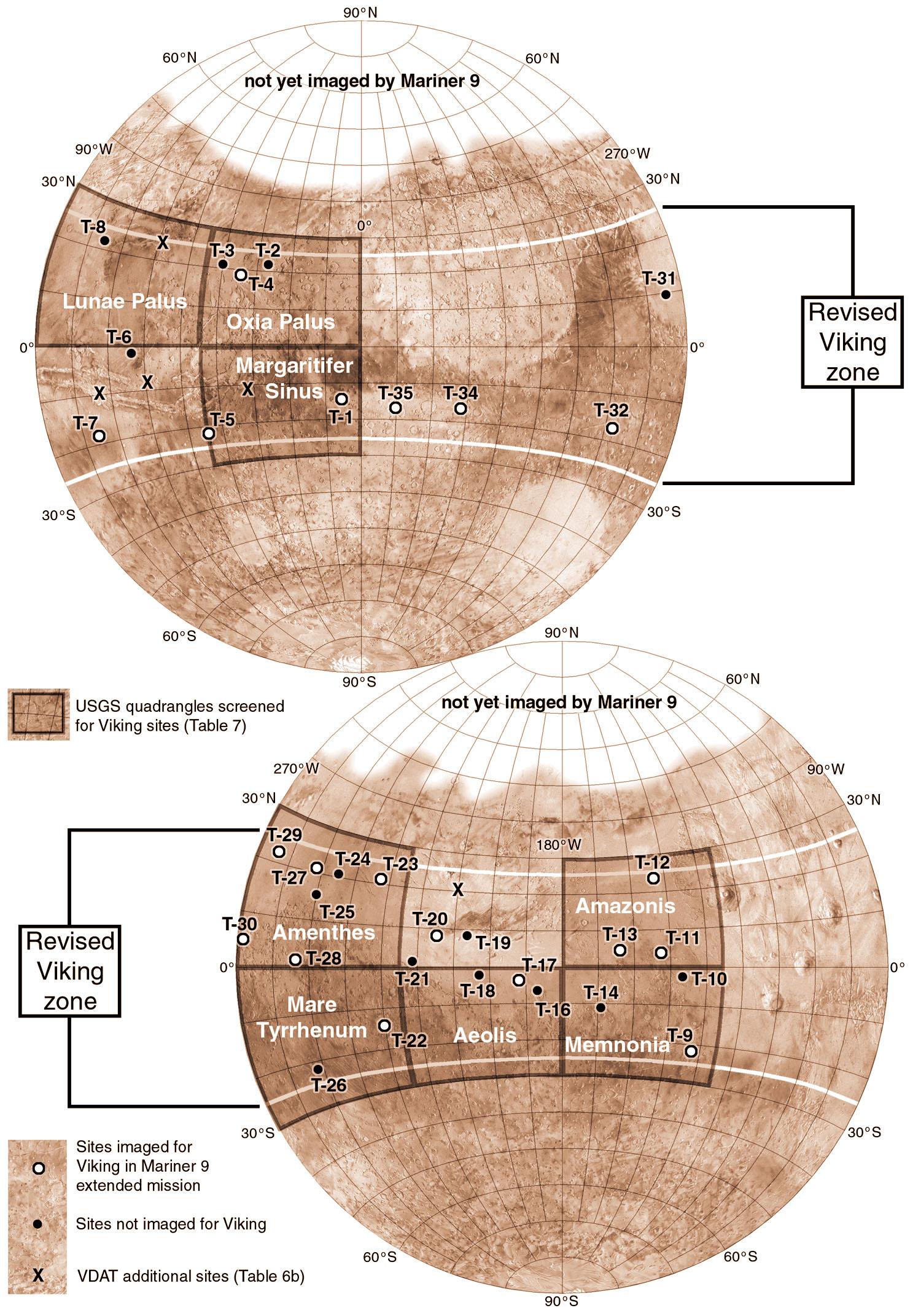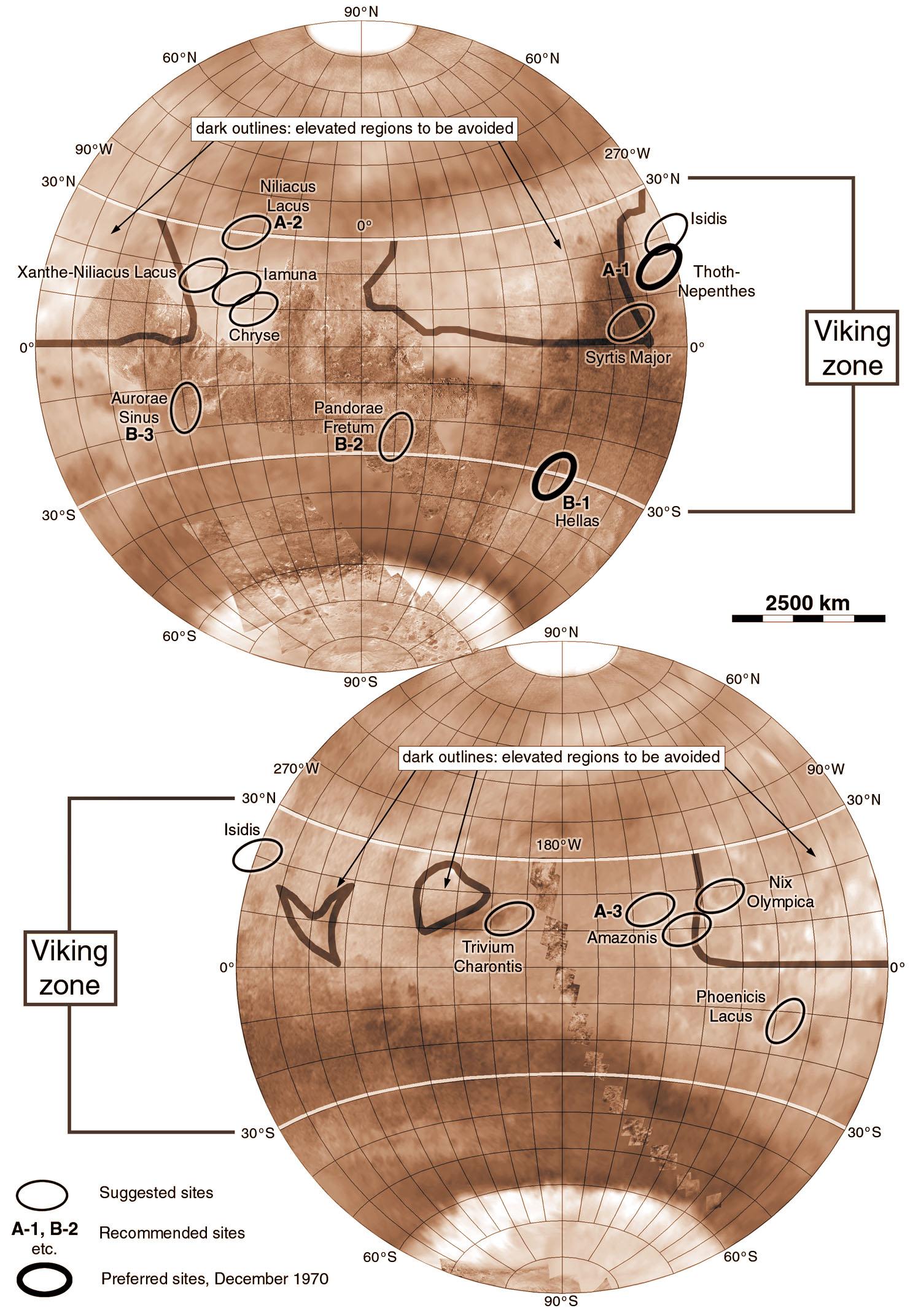 The first list of Viking landing sites drawn up by the Viking Landing Site Working Group in December 1970, drawn on a base mosaic of Mariner 6 and 7 images. The map shows the Viking Zone (between 30 north and 30 south), roughly outlined high terrain to be avoided (though elevations were VERY poorly known), and 15 ellipses marking the suggested sites. Two were recommended, in Hellas and Thoth-Nepenthes (which today we would regard as part of Isidis)