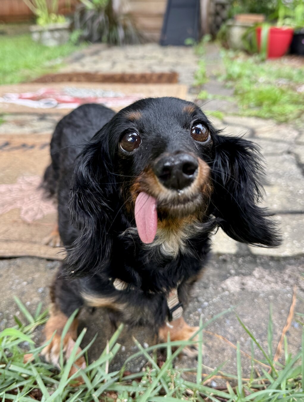 alt A miniature dachshund with her tongue hanging out of her mouth because she has lost several teeth. A miniature dachshund with her tongue hanging out of her mouth because she has lost several teeth.
