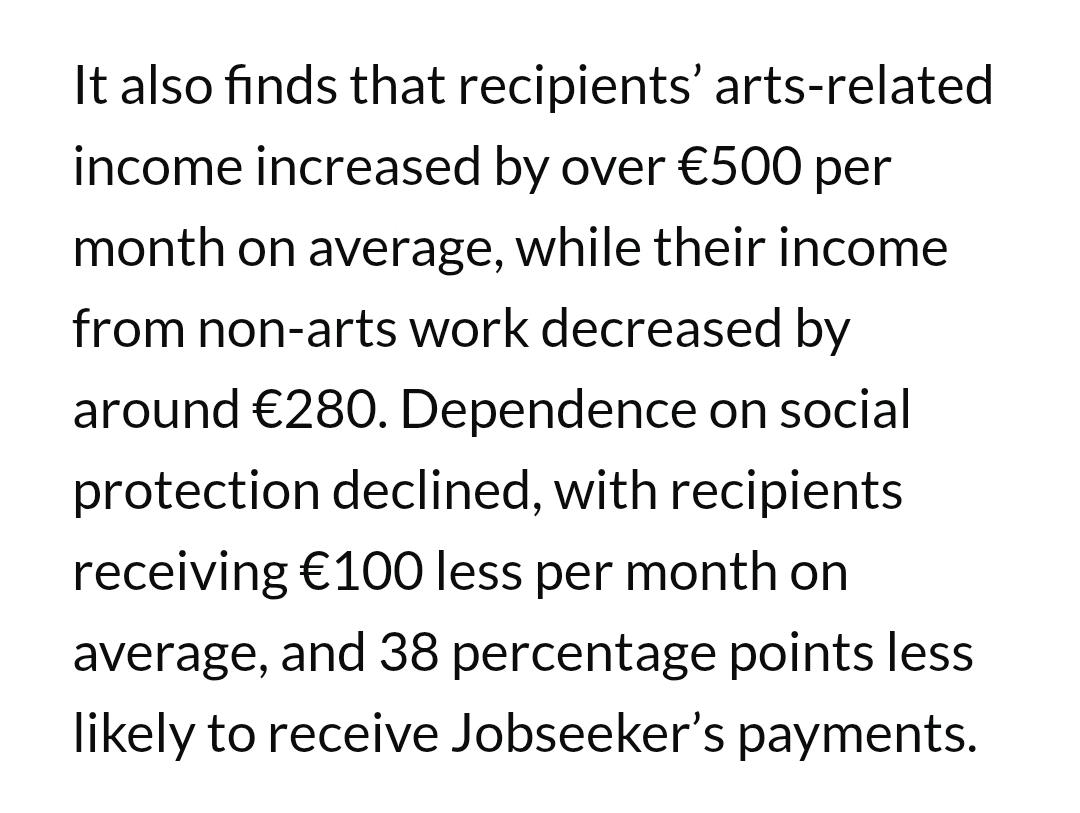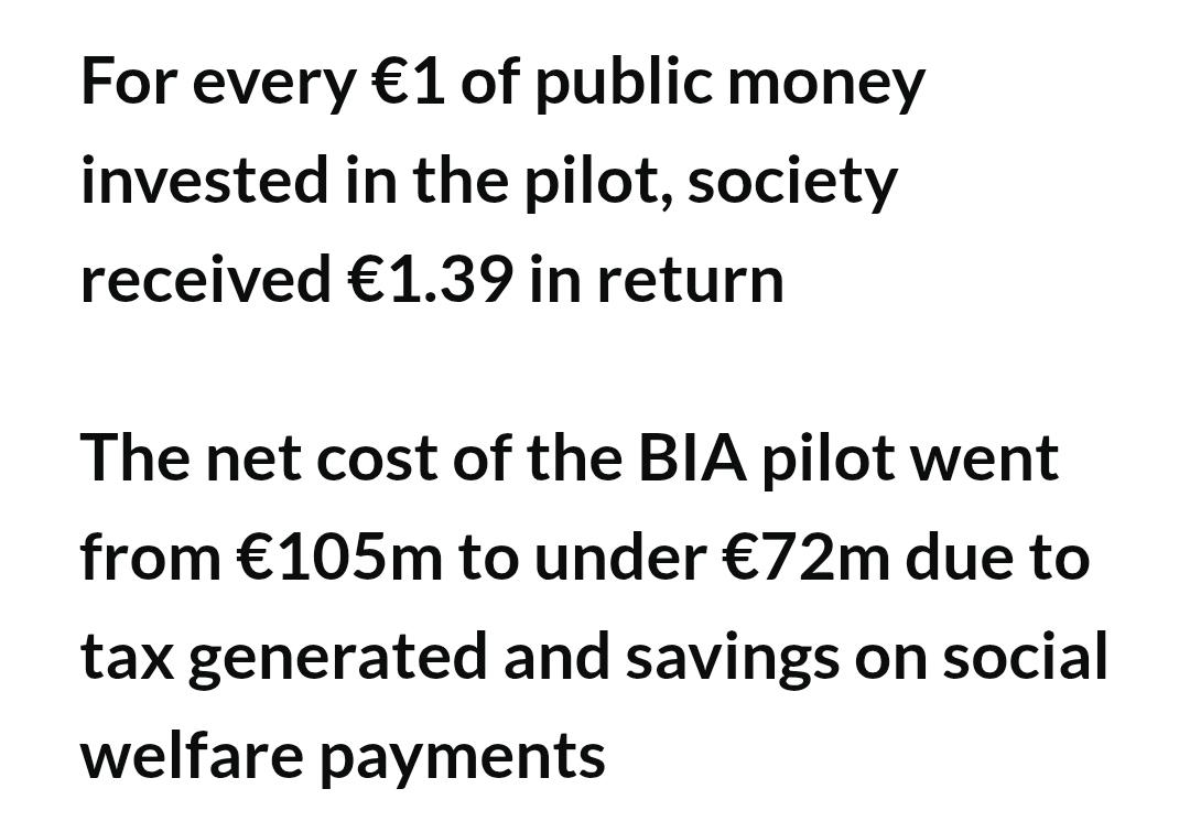Ireland just released a report showing the huge success of the unconditional basic income it provided to artists. Each $1 spent led to society gaining $1.39. Artists' earned incomes went up more than their side job incomes fell. And they were happier and used less welfare
