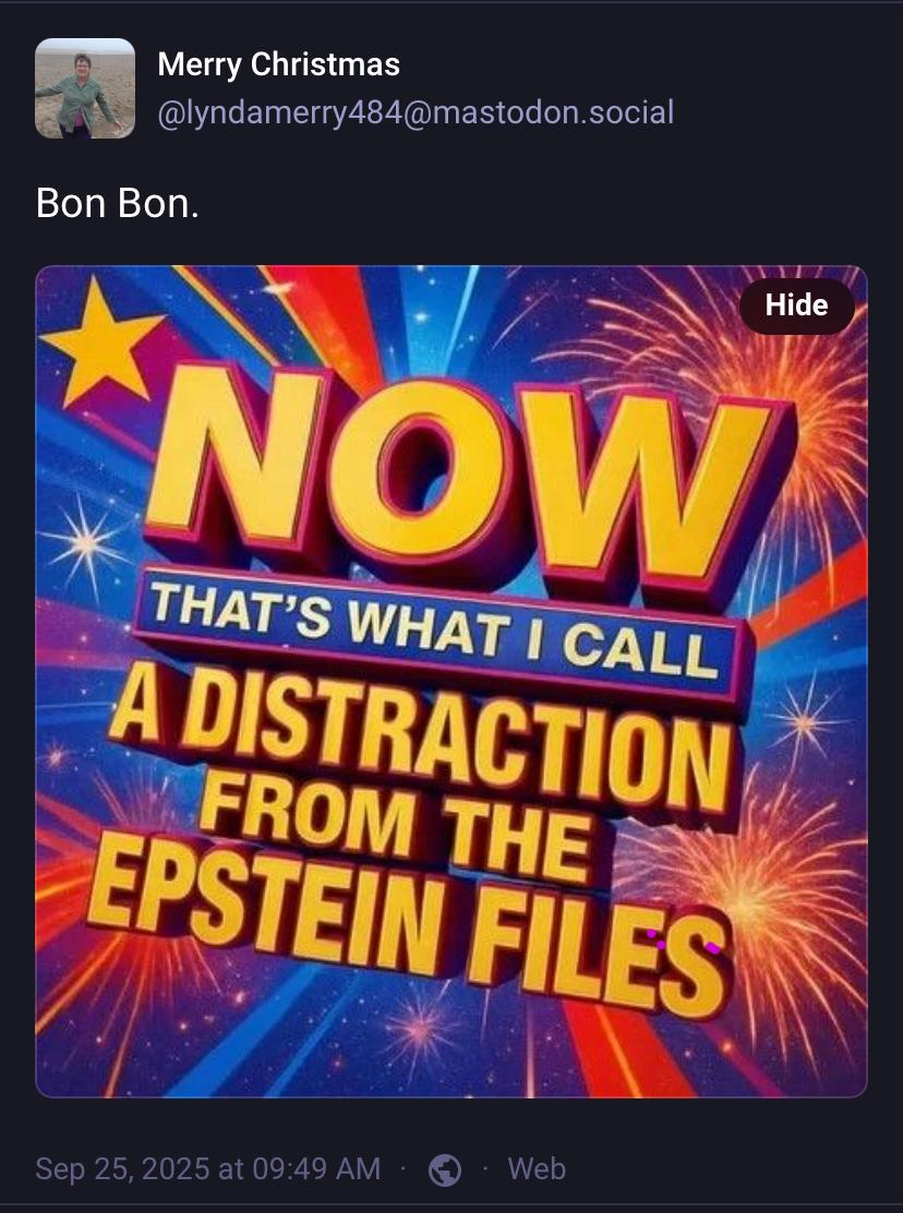 Borrowed from Merry Christmas @lyndamerry484@mastodon.social Bold (mostly yellow) text reads: NOW THAT'S WHAT I CALL A DISTRACTION FROM THE EPSTEIN FILES Surrounded by fireworks 🎆 yellow stars, red white blue and yellow streaks … basically trying to make it look “Spectacular!” and showy, like a price is right announcement 📣